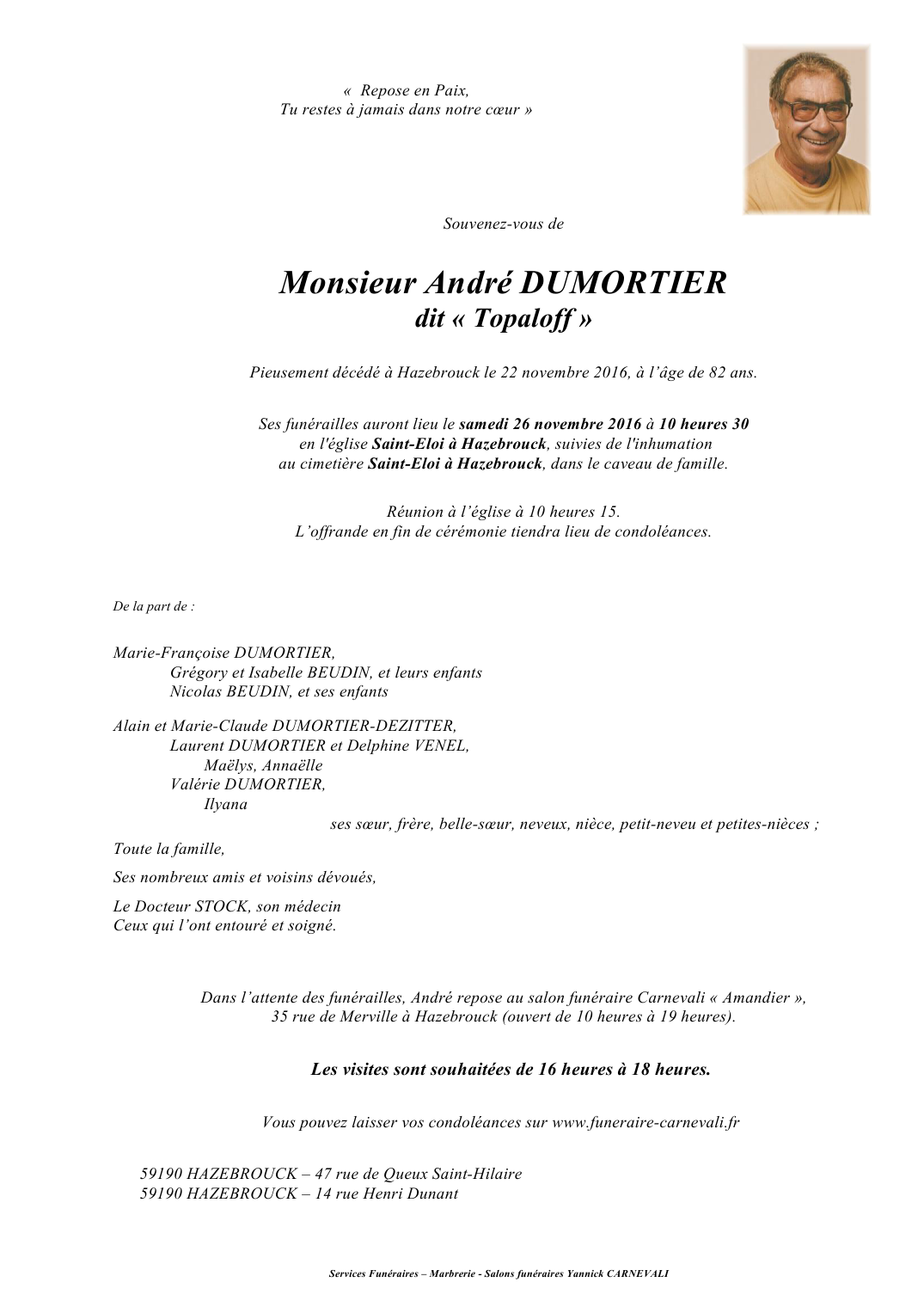 Décédé à Hazebrouck (59190, France) le mardi 22 novembre 2016 à l'âge de 82 ans