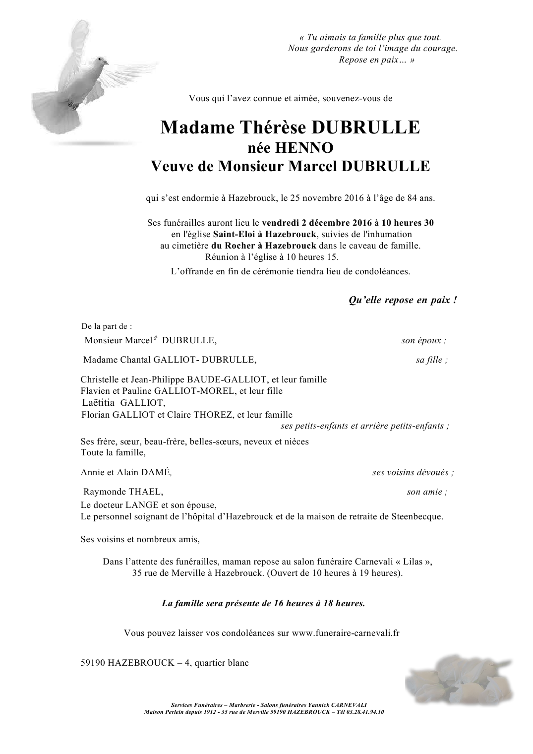 Décédée à Hazebrouck (59190, France) le vendredi 25 novembre 2016 à l'âge de 84 ans
