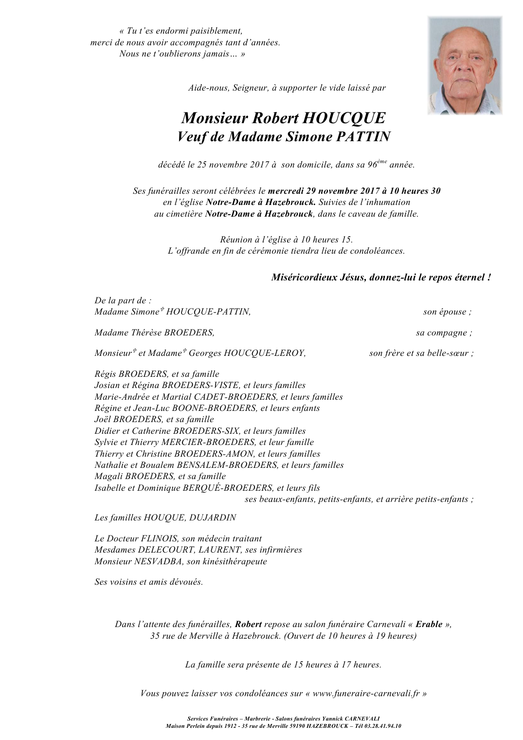 Décédé à Hazebrouck (59190, France) le samedi 25 novembre 2017 à l'âge de 95 ans