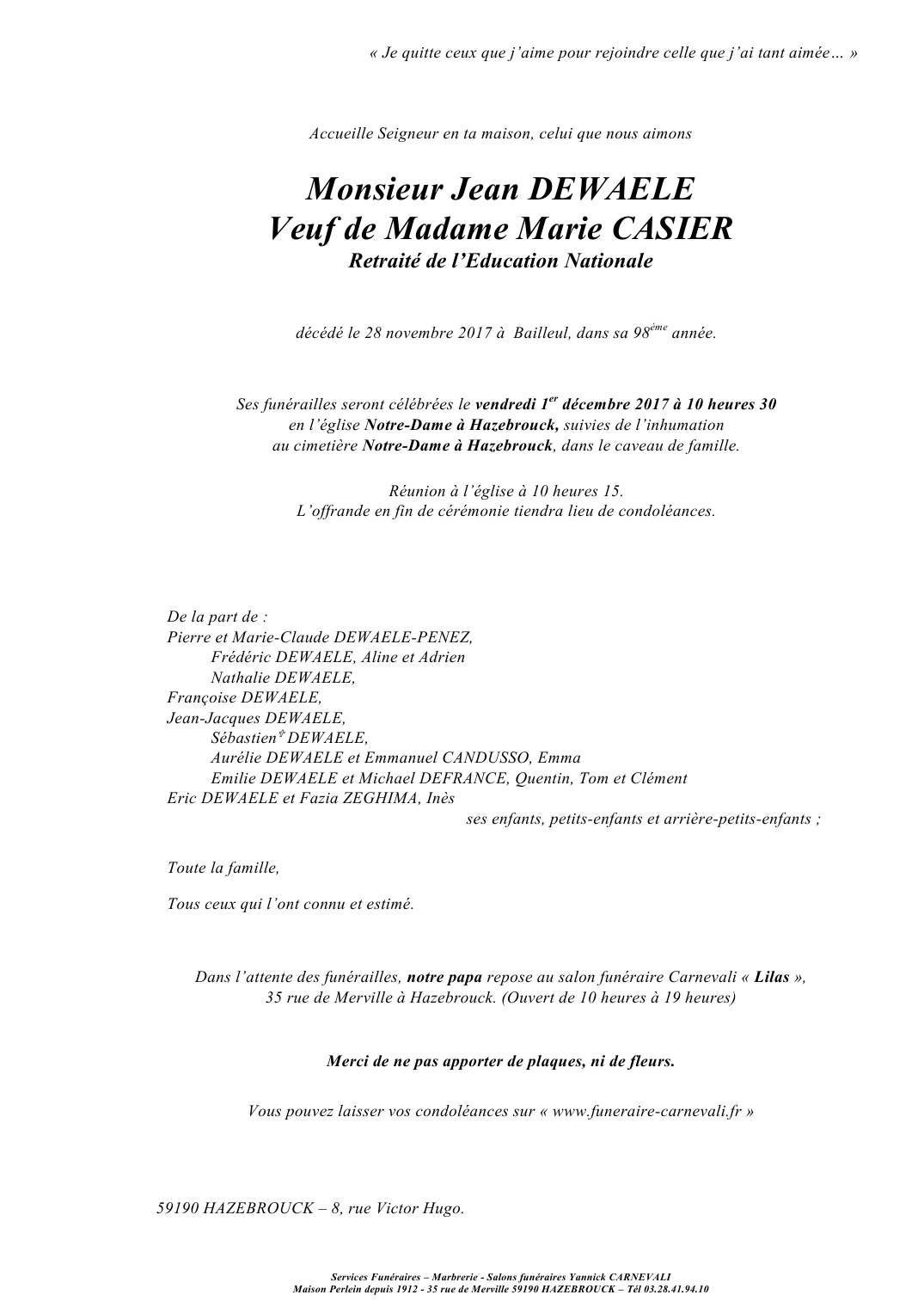 Décédé à Bailleul (59270, France) le mardi 28 novembre 2017 à l'âge de 97 ans