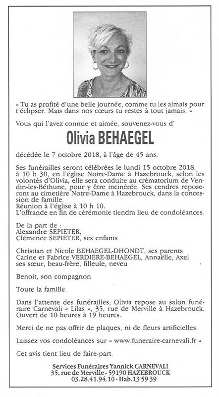 Décédée à Hazebrouck (59190, France) le dimanche 7 octobre 2018 à l'âge de 45 ans