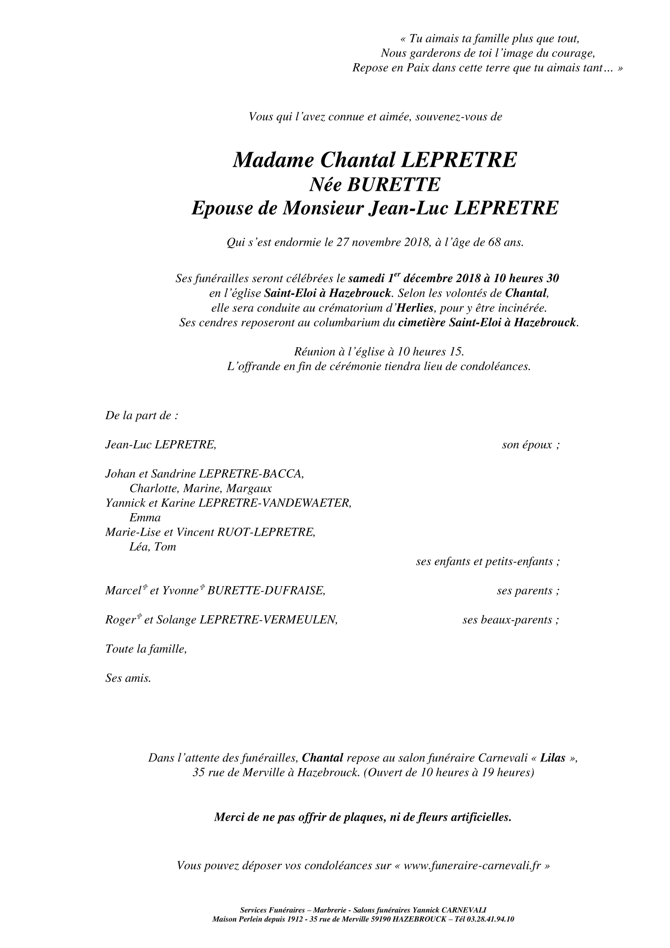 Madame Chantal LEPRETRE née BURETTE