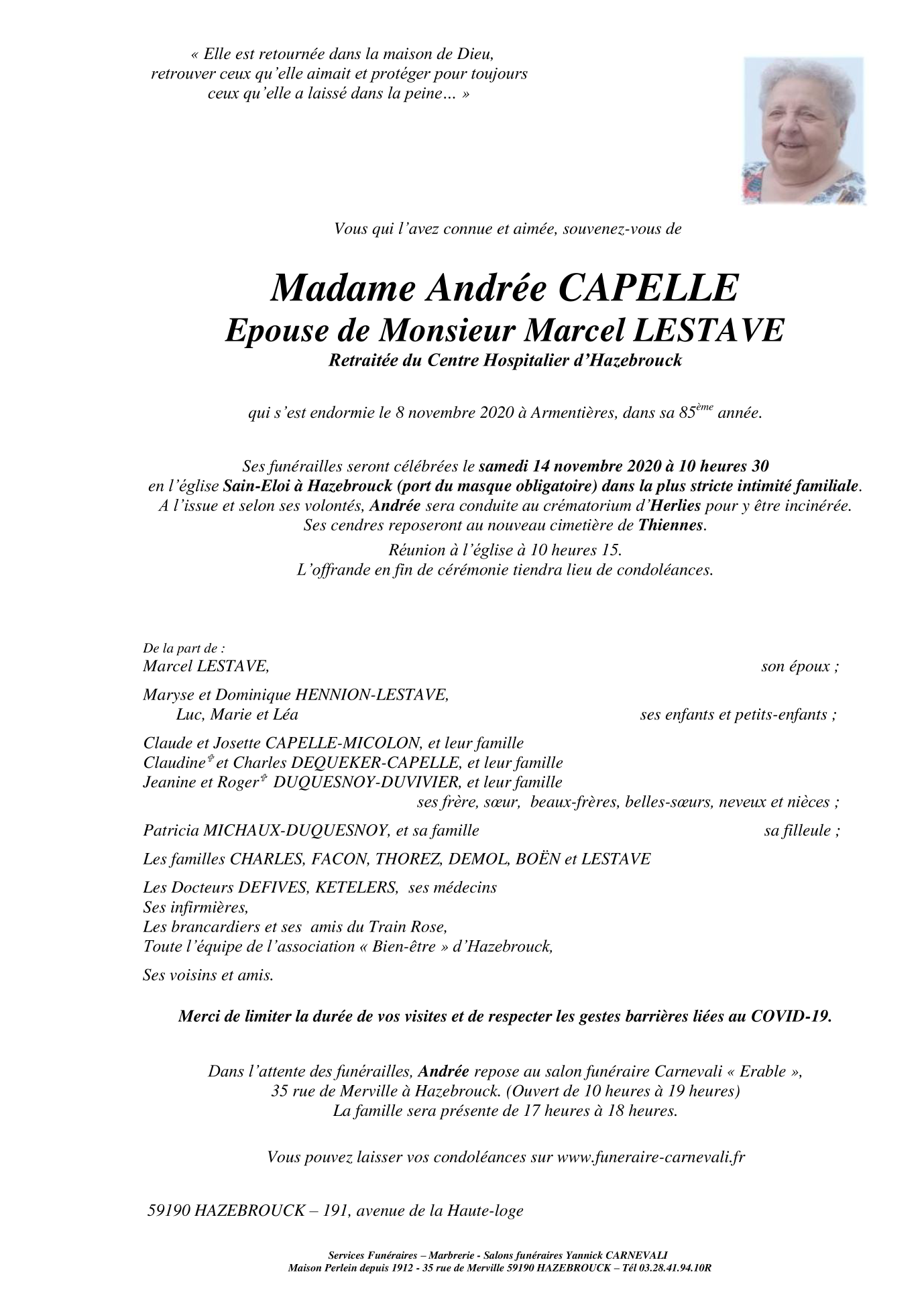 Décédée à Armentières (59280, France) le dimanche 8 novembre 2020 à l'âge de 85 ans