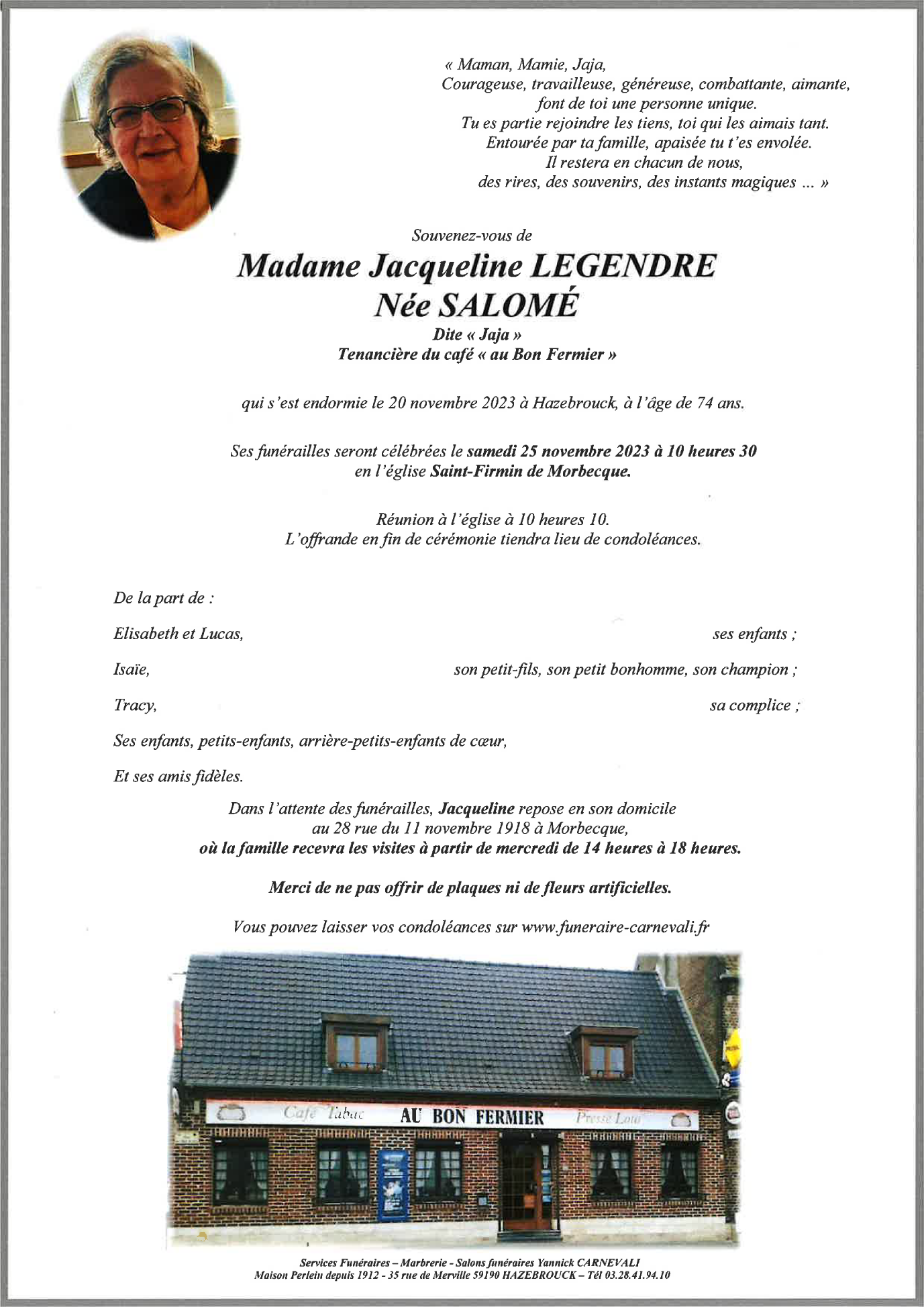 Décédée à Hazebrouck (59190, France) le lundi 20 novembre 2023 à l'âge de 74 ans