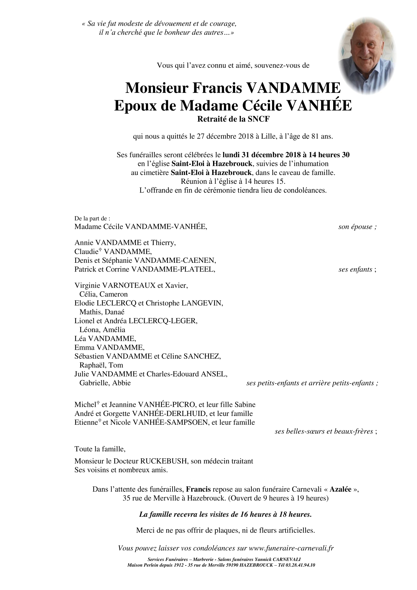 Décédé à Lille (59000, France) le jeudi 27 décembre 2018 à l'âge de 81 ans