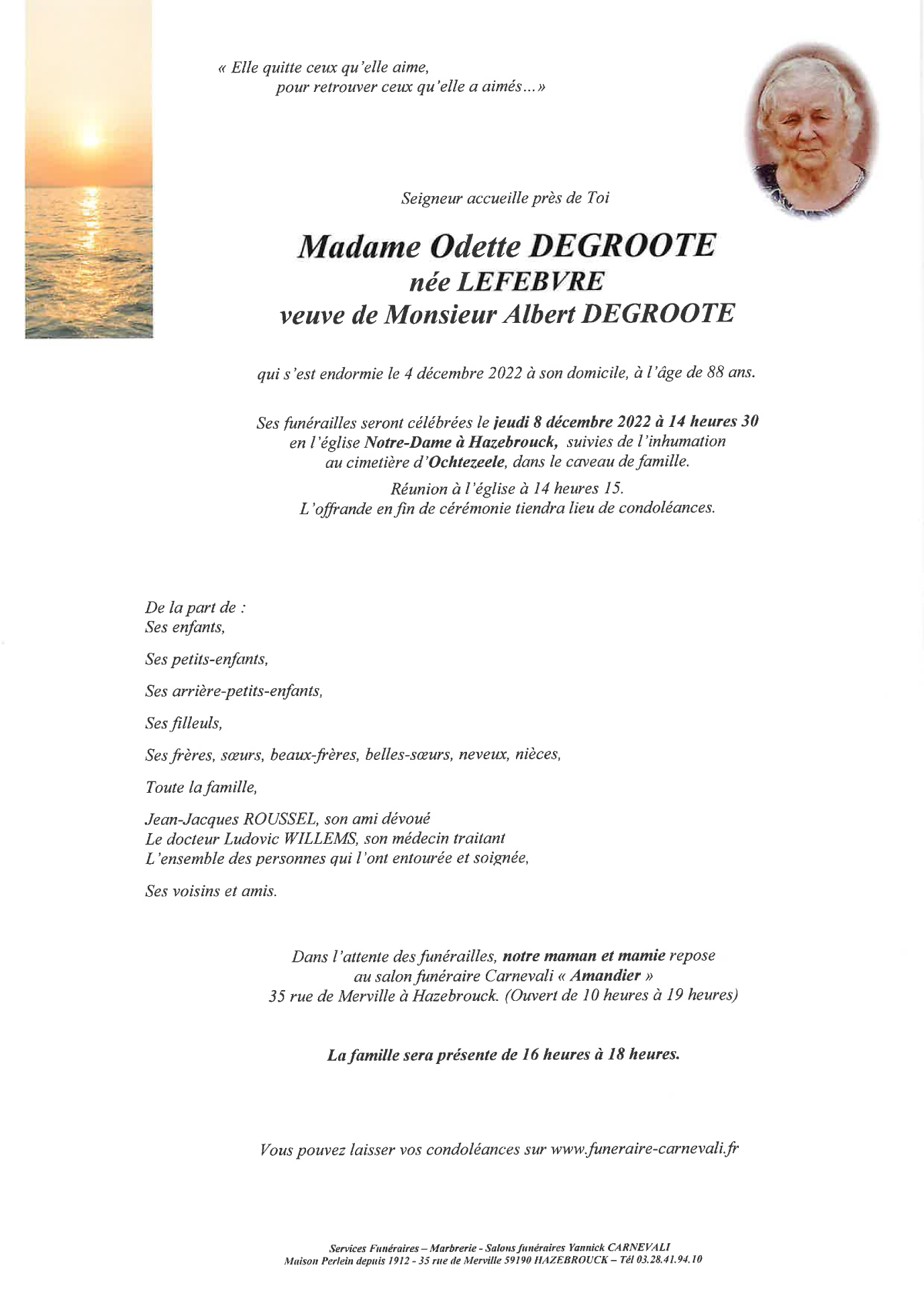 Décédée à Hazebrouck (59190, France) le dimanche 4 décembre 2022 à l'âge de 88 ans