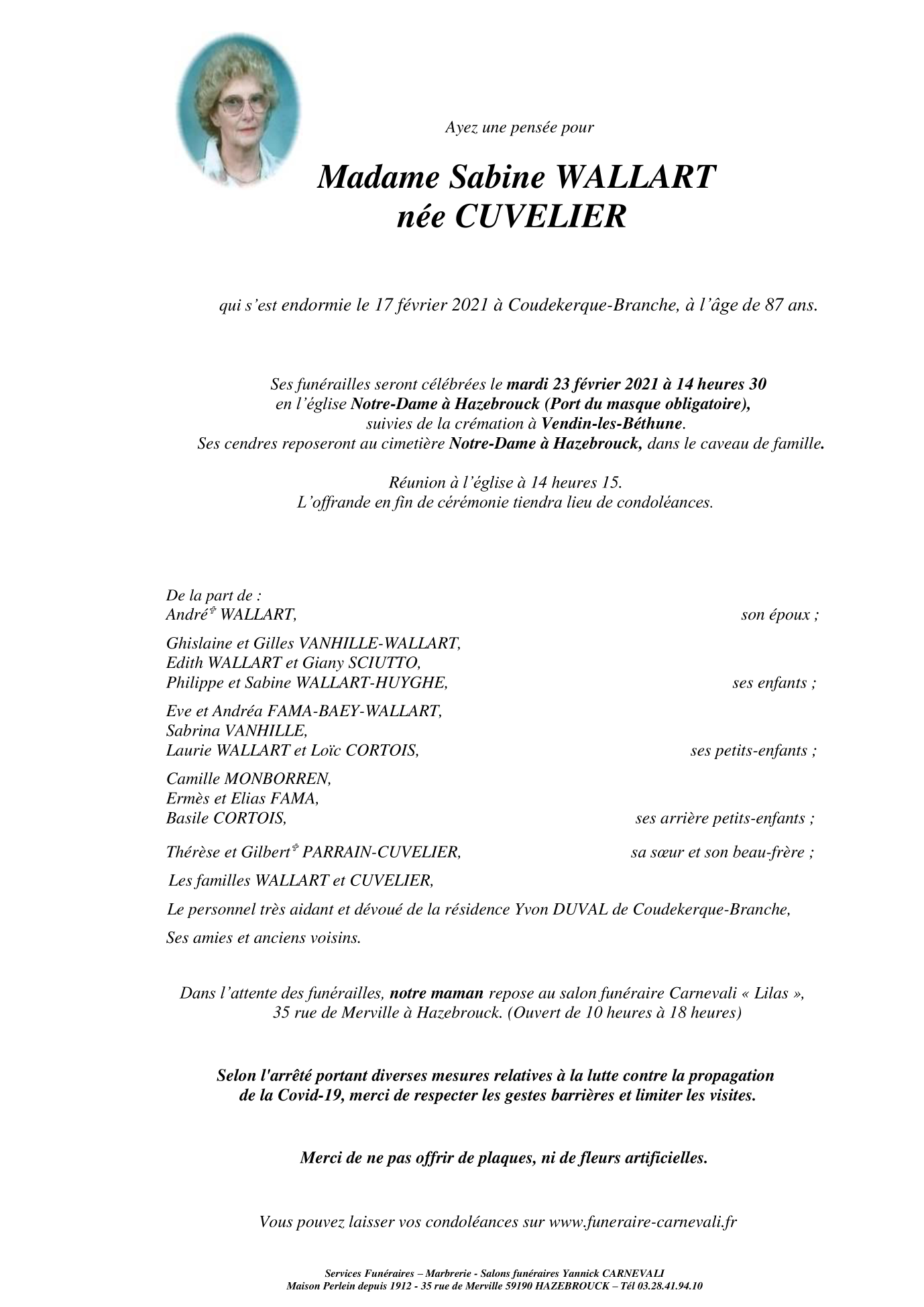 Décédée à Coudekerque-Branche (59210, France) le mercredi 17 février 2021 à l'âge de 87 ans