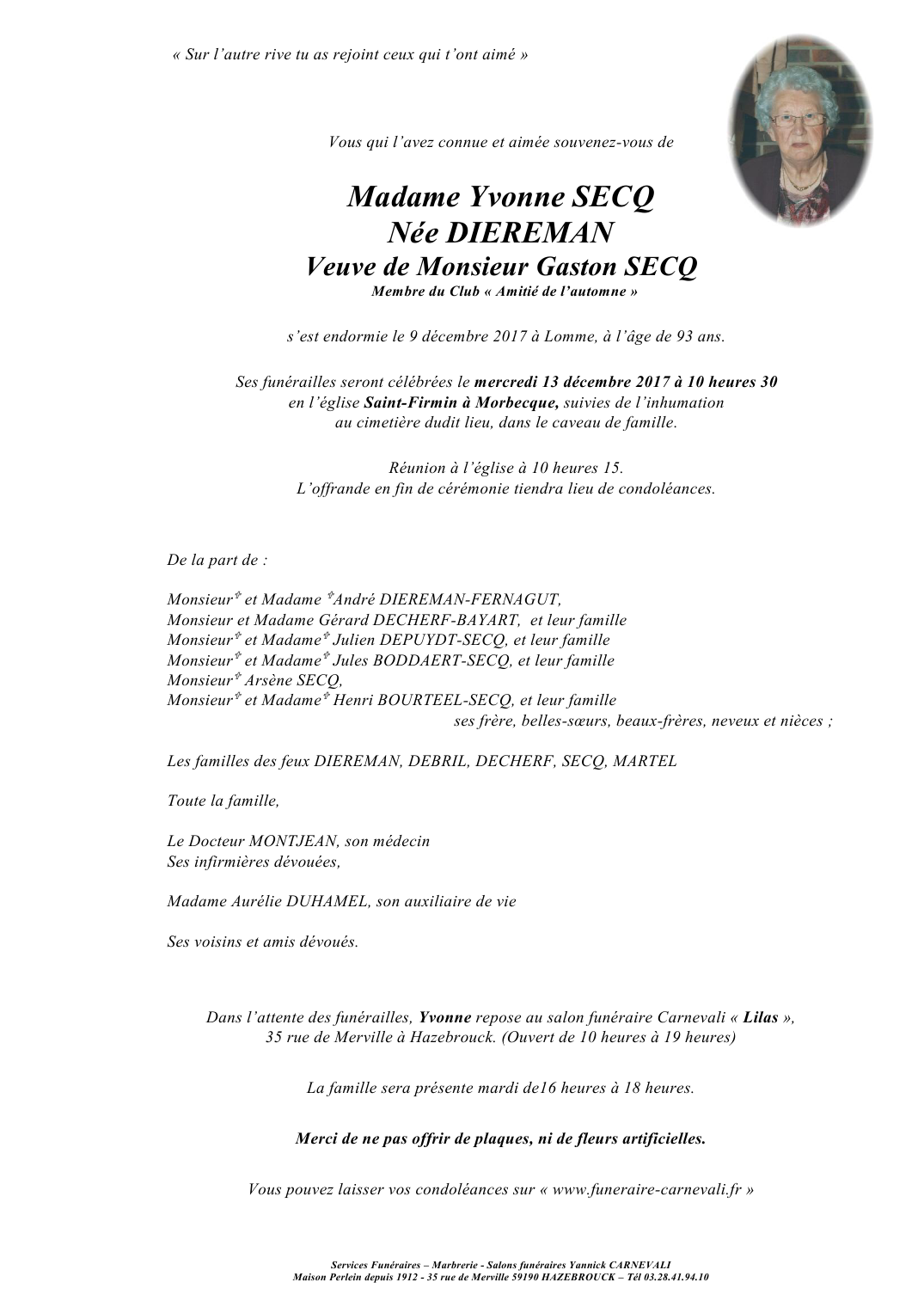 Décédée à Lomme (59160, France) le samedi 9 décembre 2017 à l'âge de 93 ans