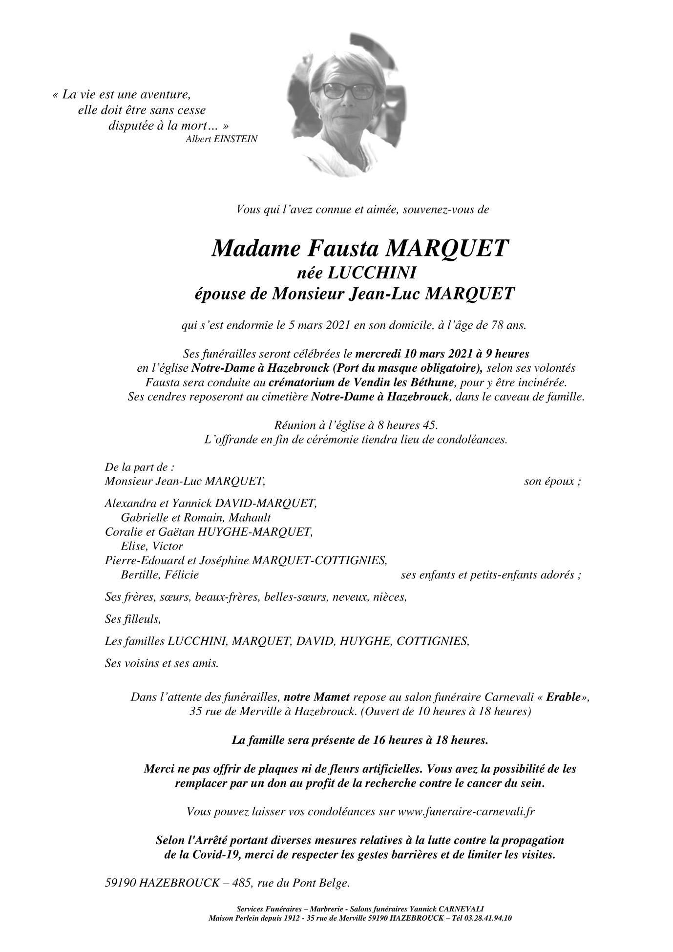 Décédée à Hazebrouck (59190, France) le vendredi 5 mars 2021 à l'âge de 78 ans