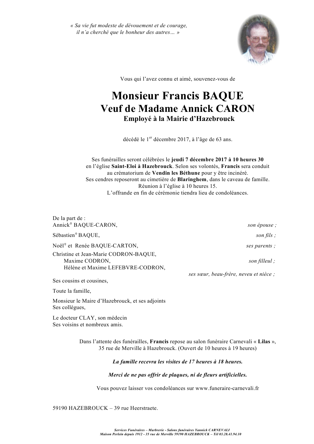 Décédé à Hazebrouck (59190, France) le vendredi 1 décembre 2017 à l'âge de 63 ans