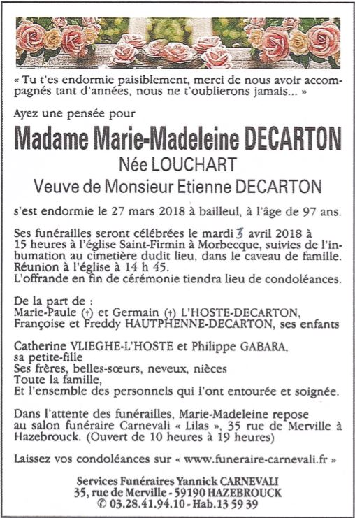 Madame Marie-Madeleine DECARTON née LOUCHART