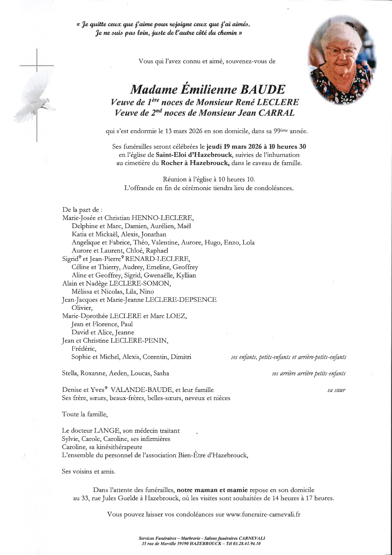Décédée à Hazebrouck (59190, France) le vendredi 13 mars 2026 à l'âge de 98 ans