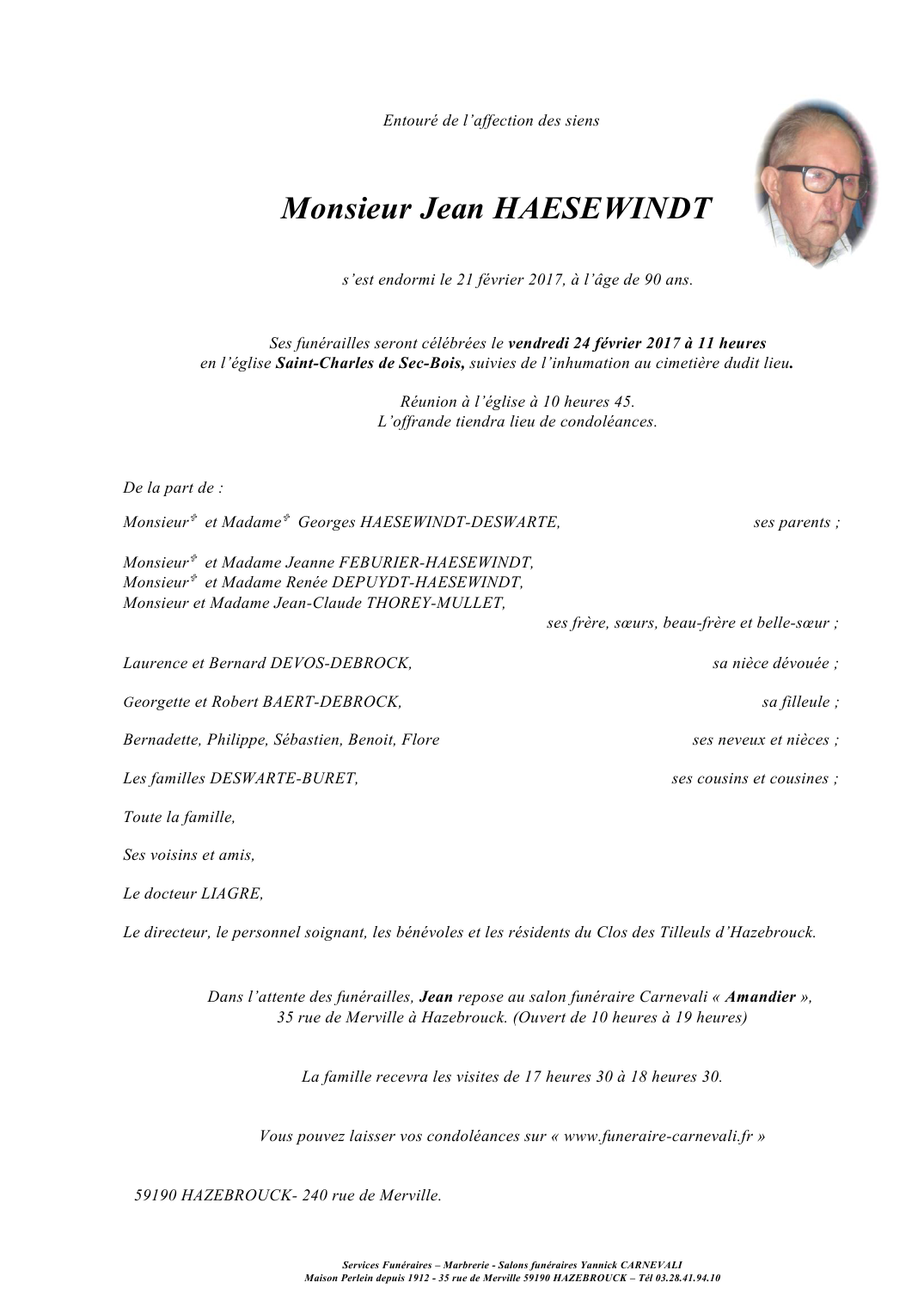 Décédé à Hazebrouck (59190, France) le mardi 21 février 2017 à l'âge de 90 ans