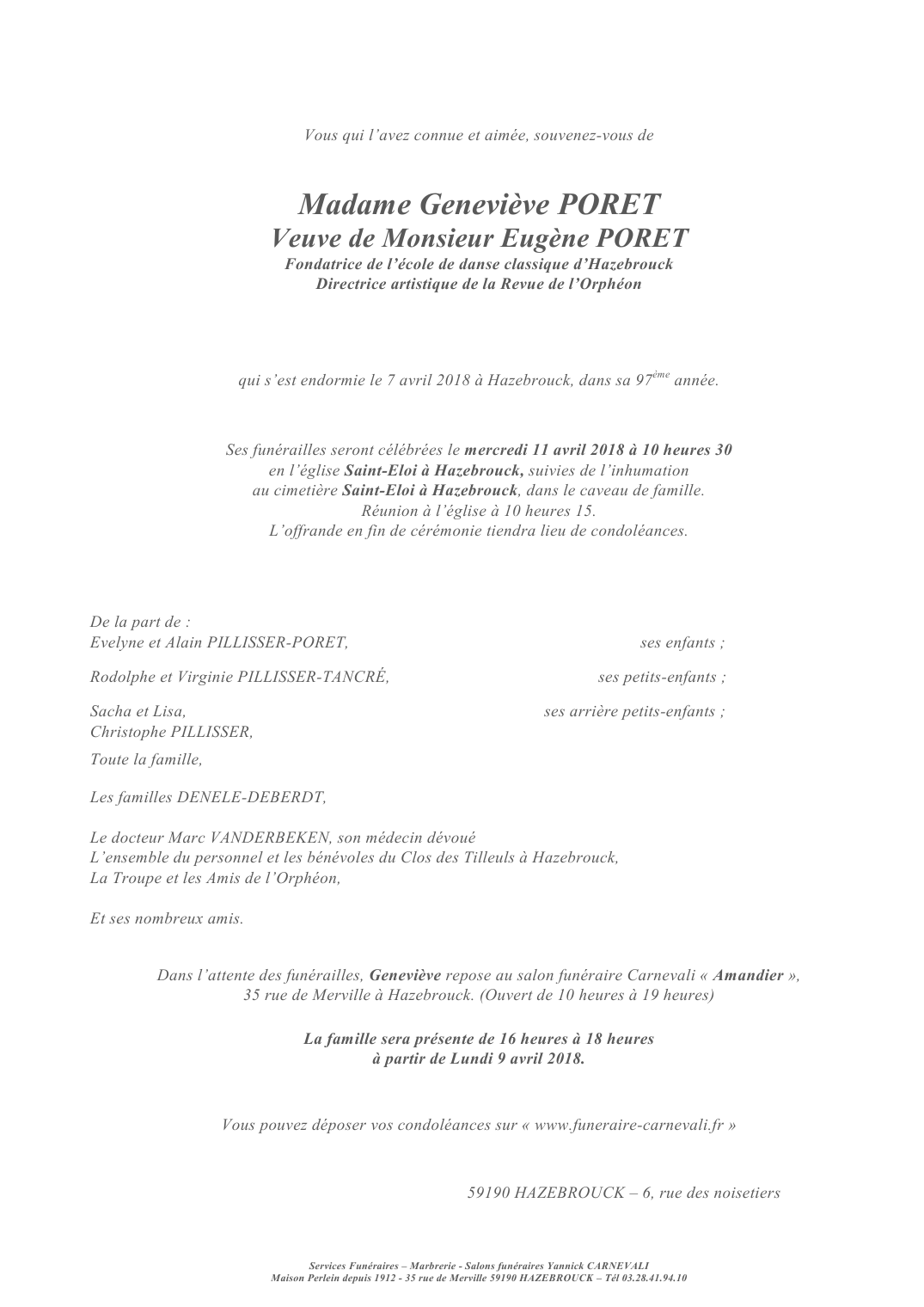 Décédée à Hazebrouck (59190, France) le samedi 7 avril 2018 à l'âge de 96 ans