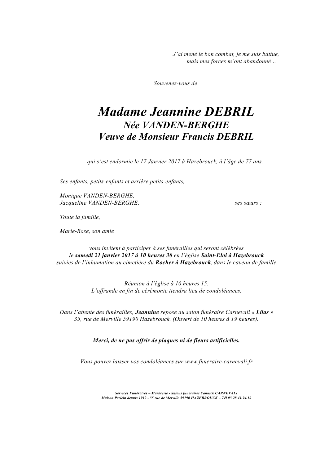 Décédée à Hazebrouck (59190, France) le mardi 17 janvier 2017 à l'âge de 78 ans