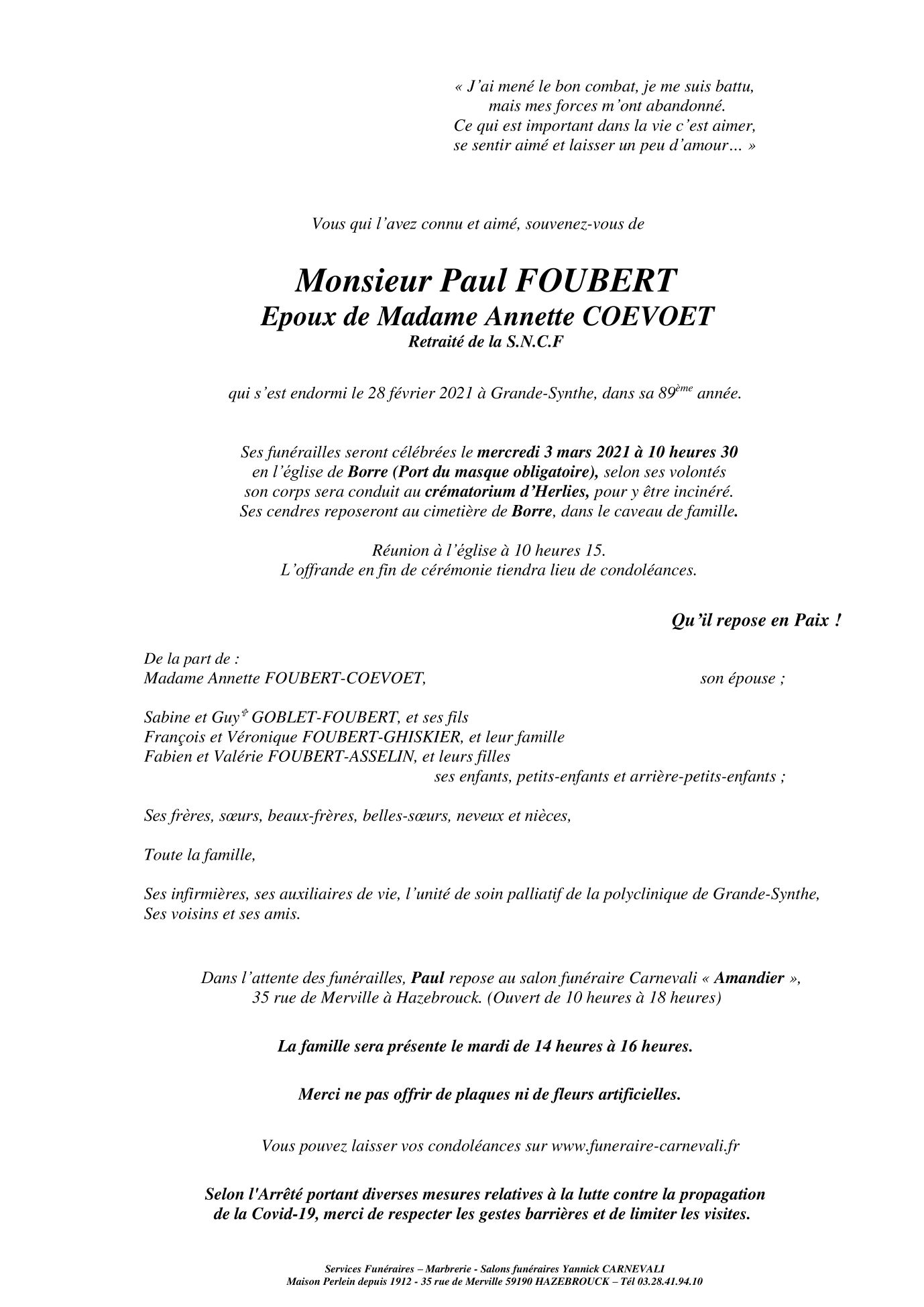 Décédé à Grande-Synthe (59760, France) le dimanche 28 février 2021 à l'âge de 88 ans