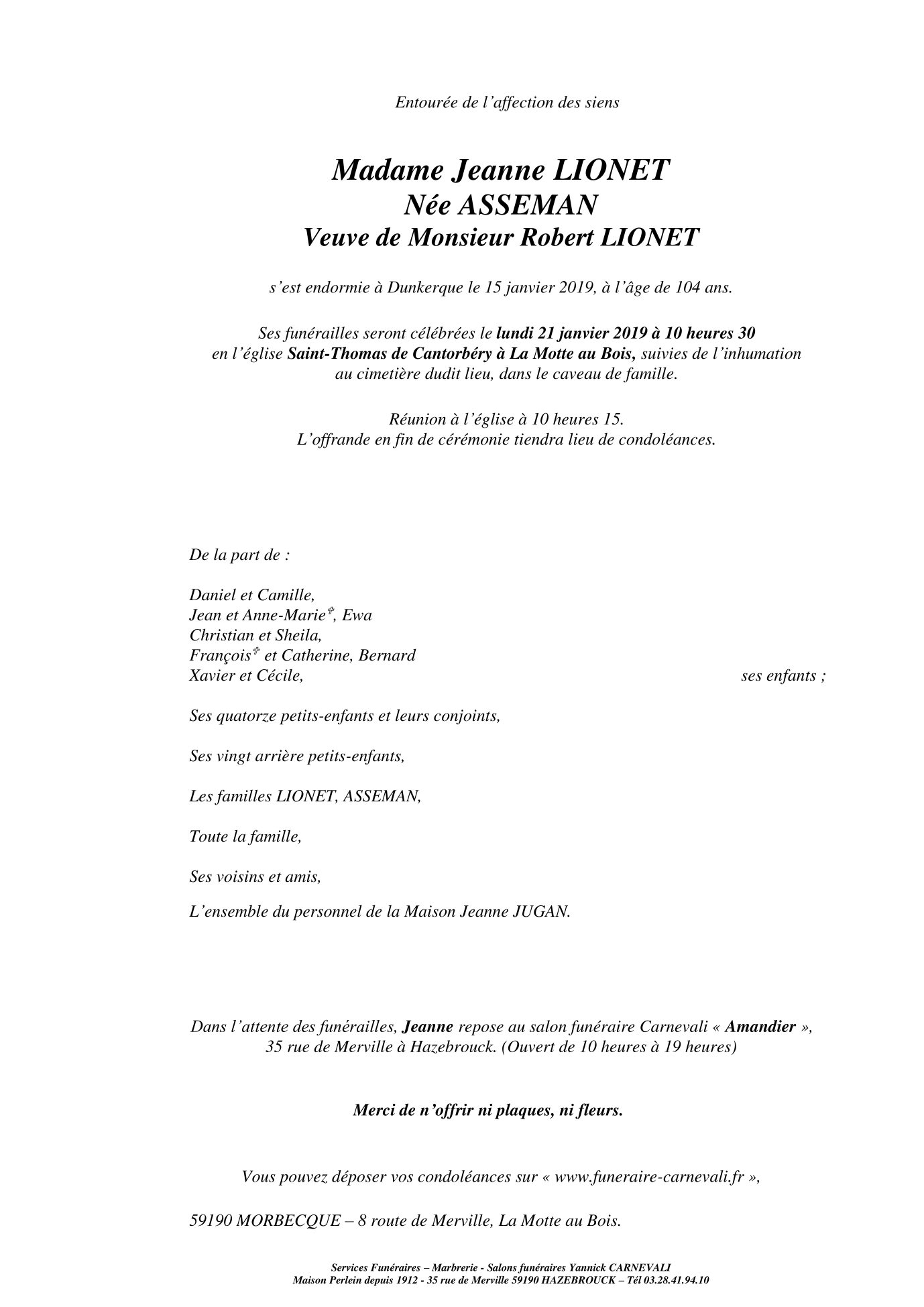 Décédée à Dunkerque (59140, France) le mardi 15 janvier 2019 à l'âge de 103 ans
