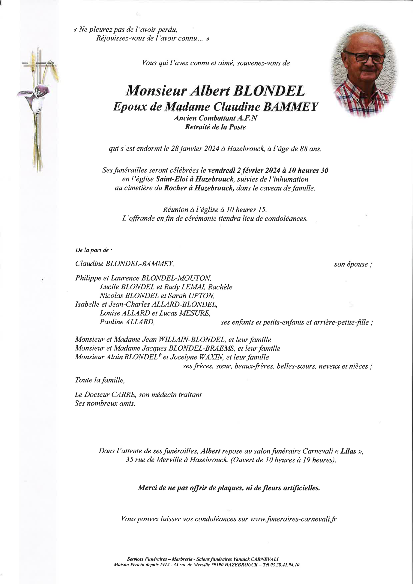 Décédé à Hazebrouck (59190, France) le dimanche 28 janvier 2024 à l'âge de 88 ans
