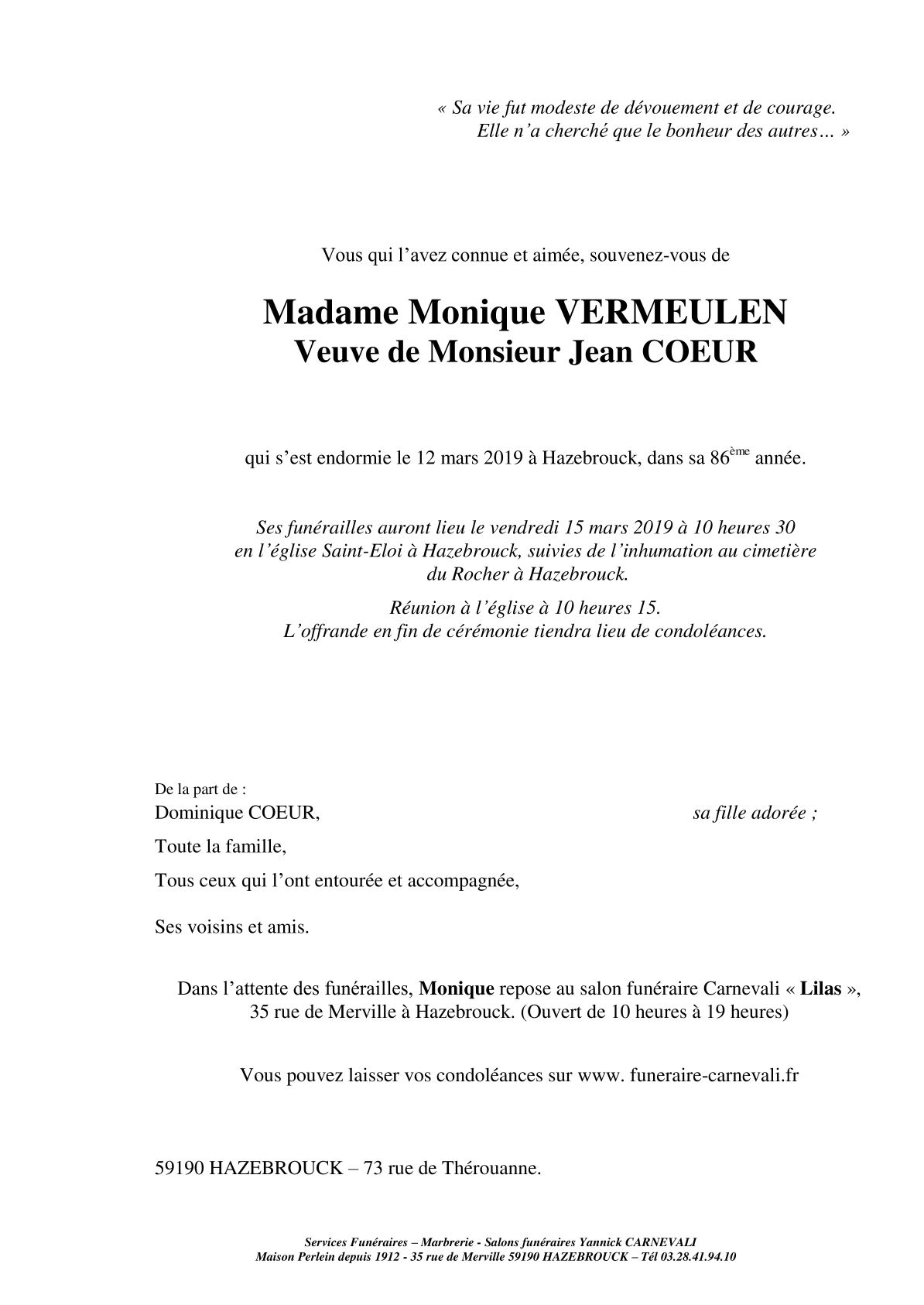 Madame Monique COEUR née VERMEULEN