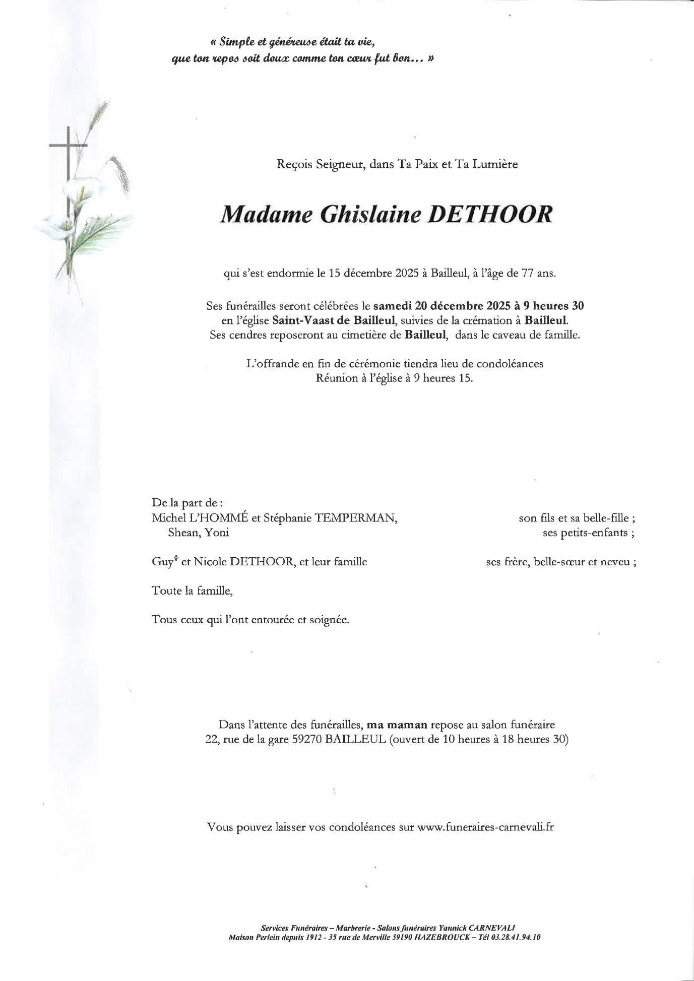 Décédée à Bailleul (59270, France) le lundi 15 décembre 2025 à l'âge de 77 ans