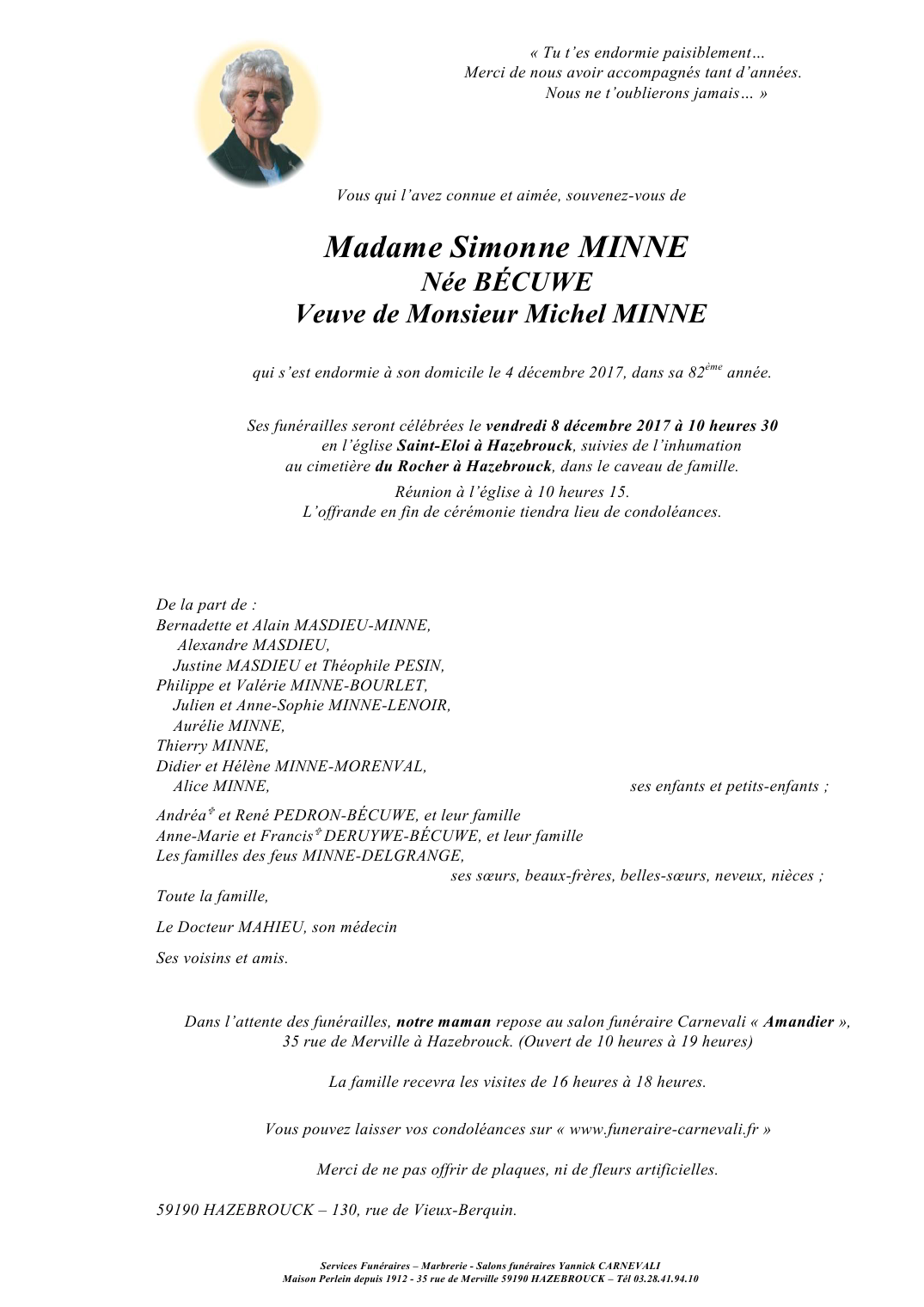 Décédée à Hazebrouck (59190, France) le lundi 4 décembre 2017 à l'âge de 81 ans