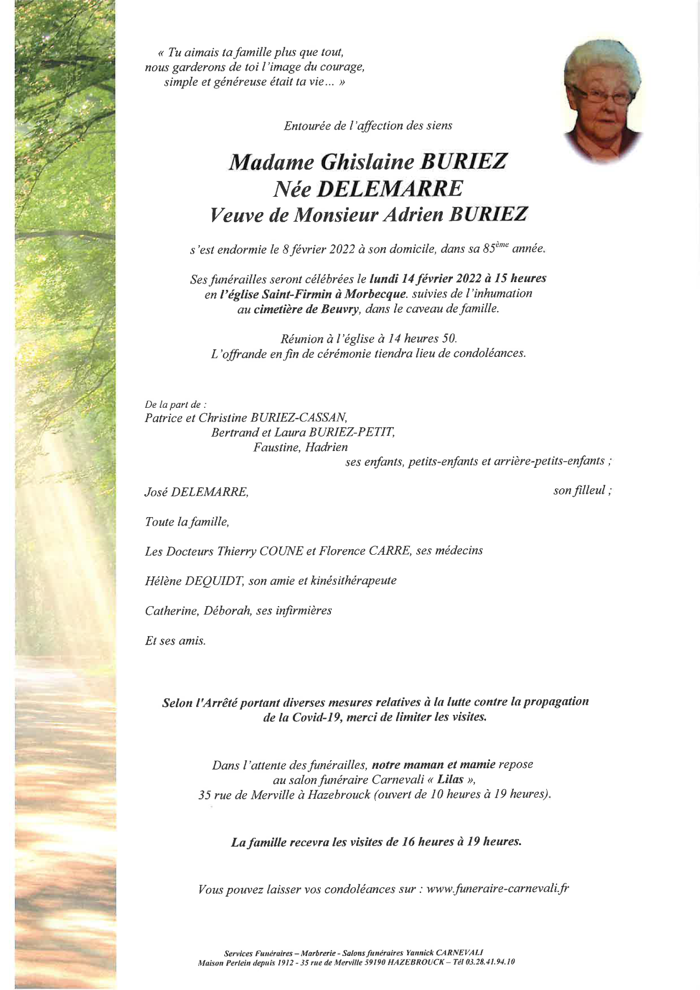 Décédée à Morbecque (59190, France) le mardi 8 février 2022 à l'âge de 84 ans