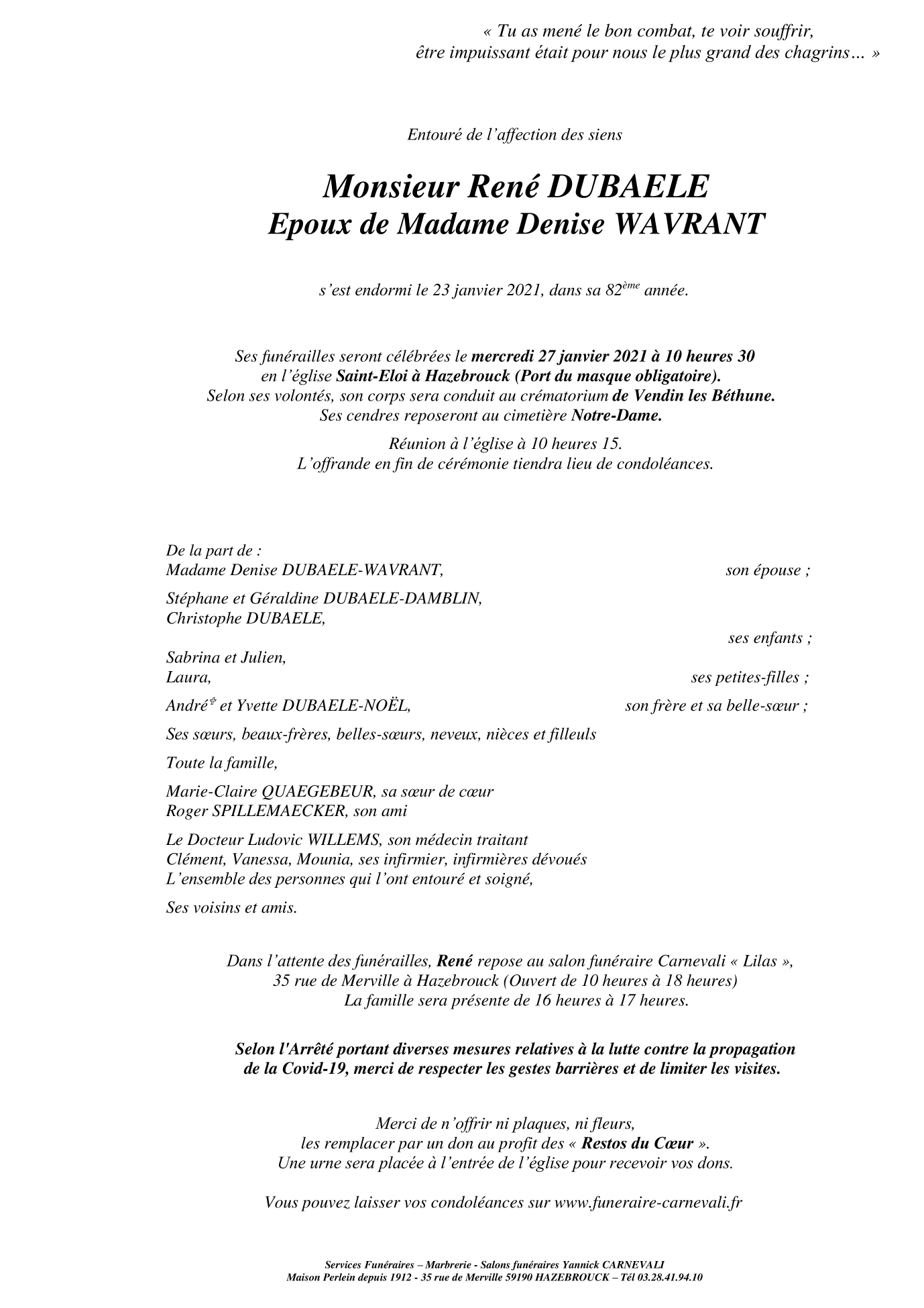 Décédé à Hazebrouck (59190, France) le samedi 23 janvier 2021 à l'âge de 81 ans