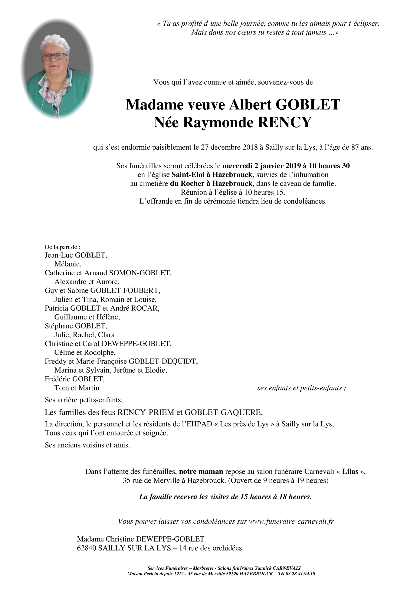 Décédée à Sailly-sur-la-Lys (62840, France) le jeudi 27 décembre 2018 à l'âge de 87 ans