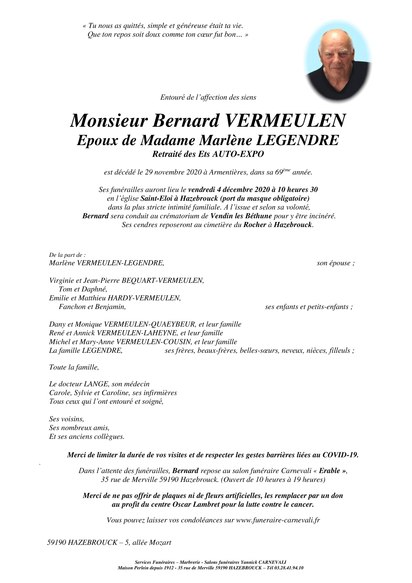 Décédé à Armentières (59280, France) le dimanche 29 novembre 2020 à l'âge de 68 ans