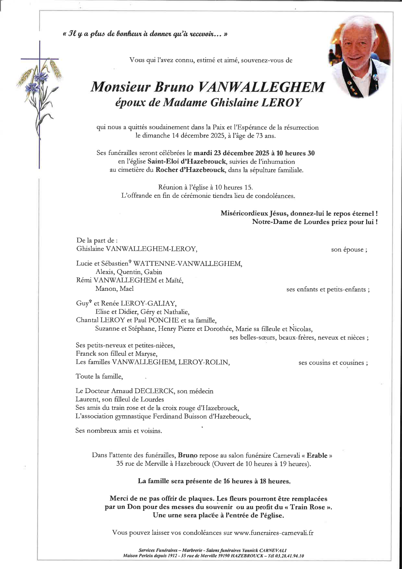 Décédé à Hazebrouck (59190, France) le dimanche 14 décembre 2025 à l'âge de 73 ans