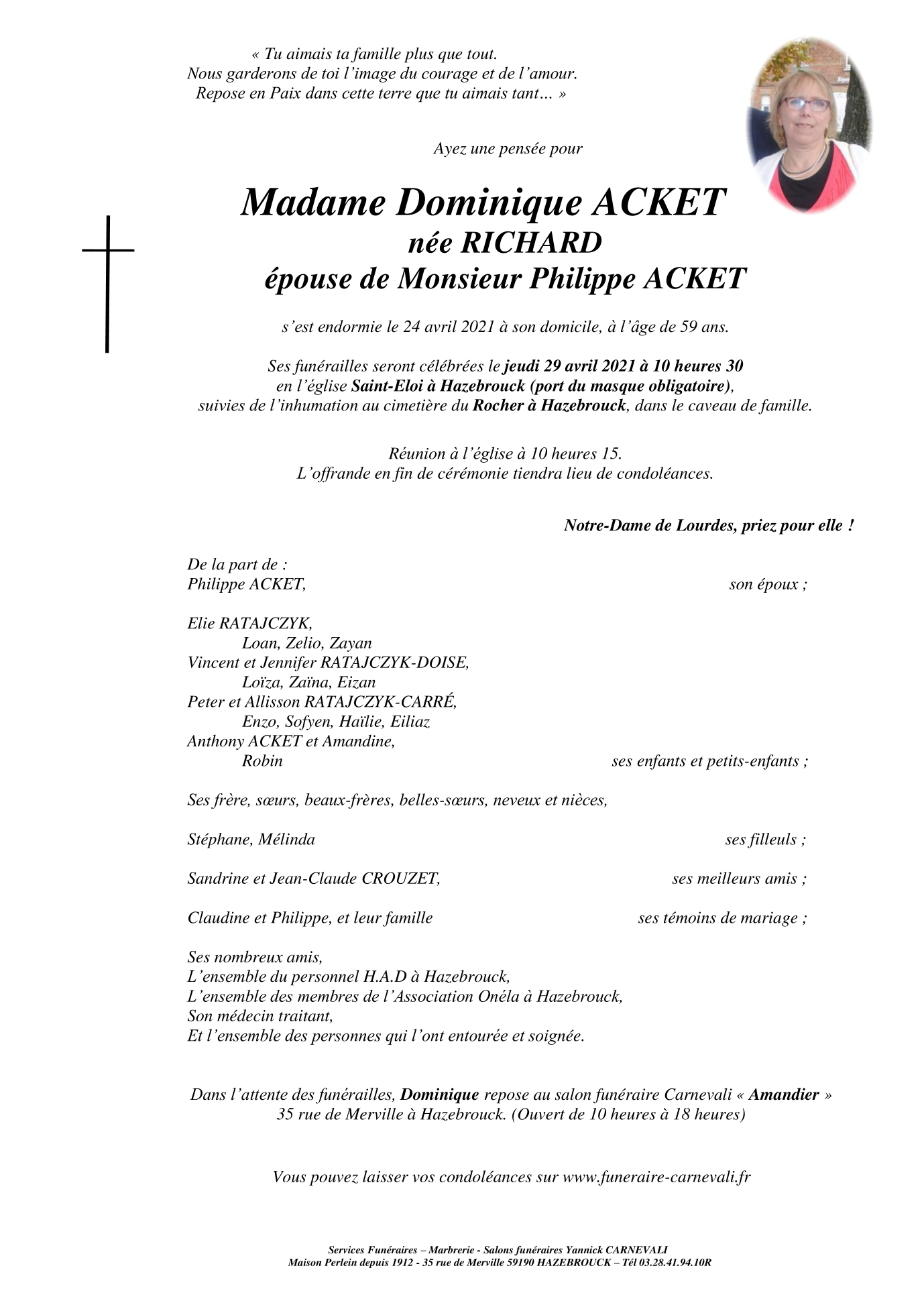 Décédée à Hazebrouck (59190, France) le samedi 24 avril 2021 à l'âge de 59 ans