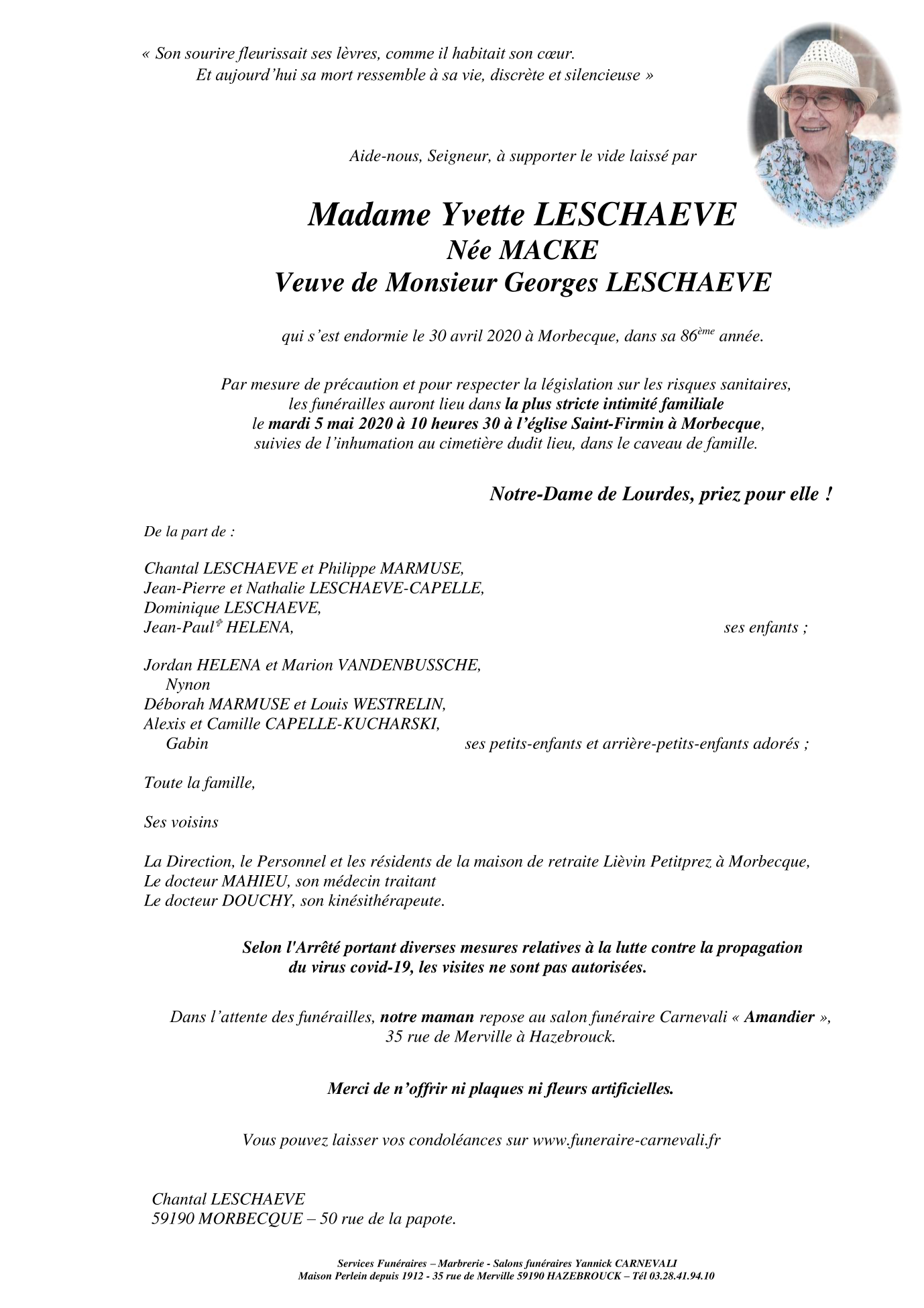 Décédée à Morbecque (59190, France) le jeudi 30 avril 2020 à l'âge de 85 ans