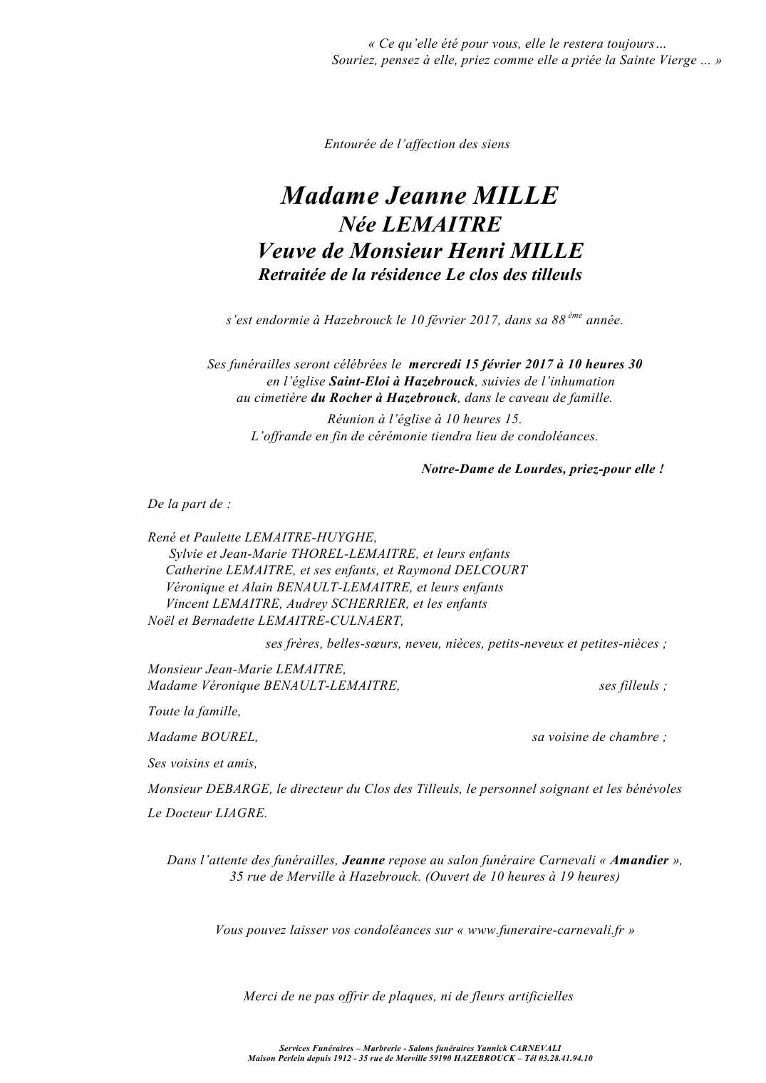 Décédée à Hazebrouck (59190, France) le vendredi 10 février 2017 à l'âge de 87 ans