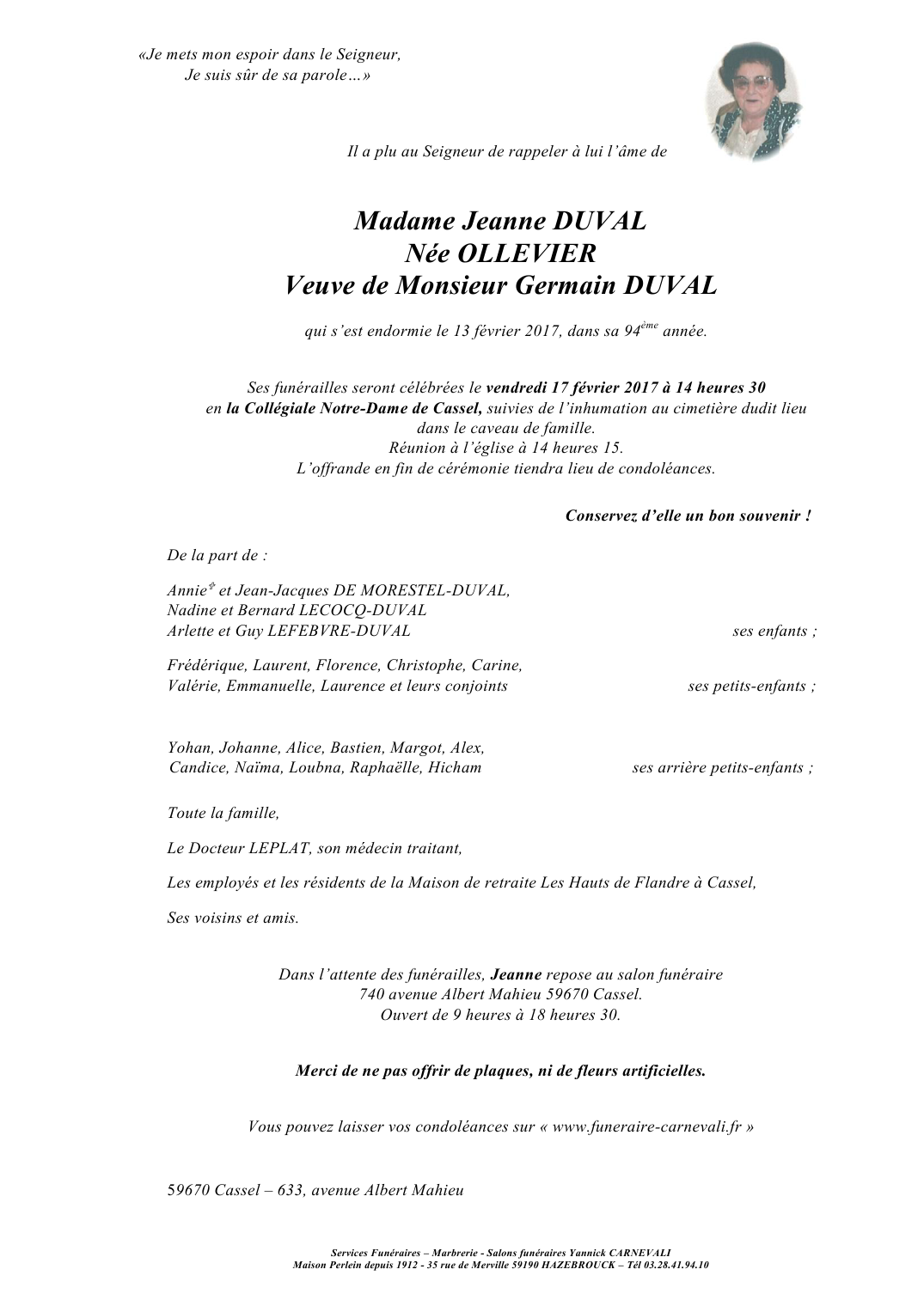 Décédée à Cassel (59670, France) le mardi 14 février 2017 à l'âge de 93 ans