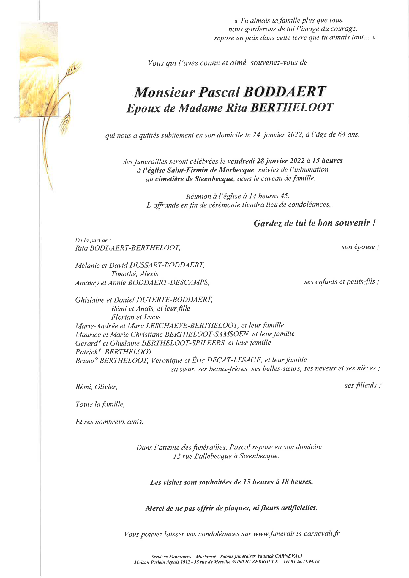 Décédé à Stéenbecque (59189, France) le lundi 24 janvier 2022 à l'âge de 64 ans