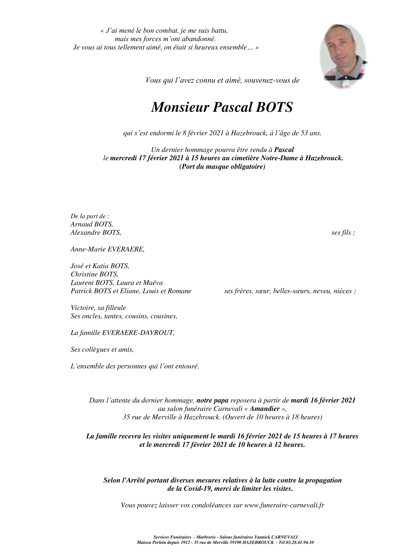 Décédé à Hazebrouck (59190, France) le lundi 8 février 2021 à l'âge de 53 ans