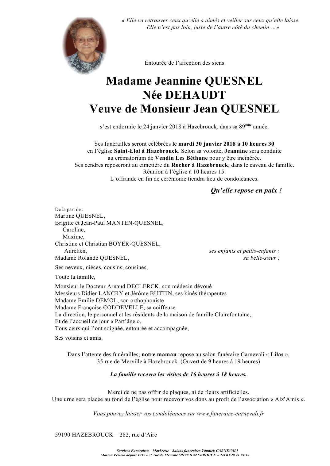 Décédée à Hazebrouck (59190, France) le mercredi 24 janvier 2018 à l'âge de 88 ans