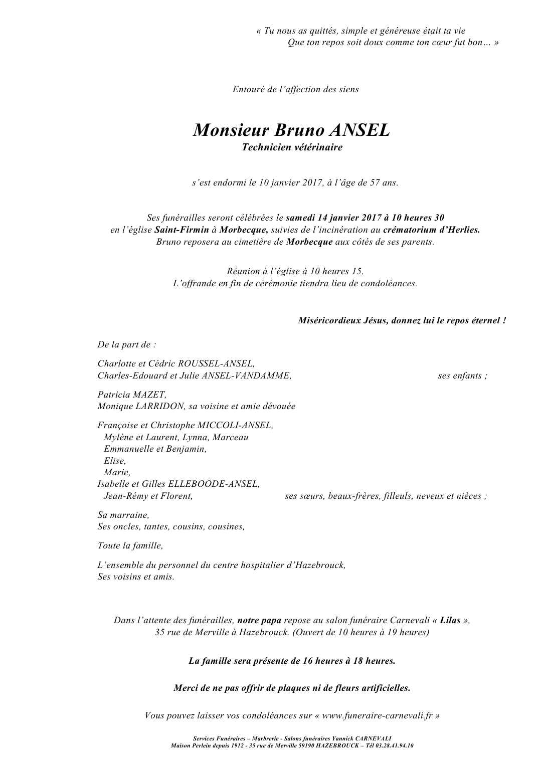 Décédé à Hazebrouck (59190, France) le mardi 10 janvier 2017 à l'âge de 57 ans