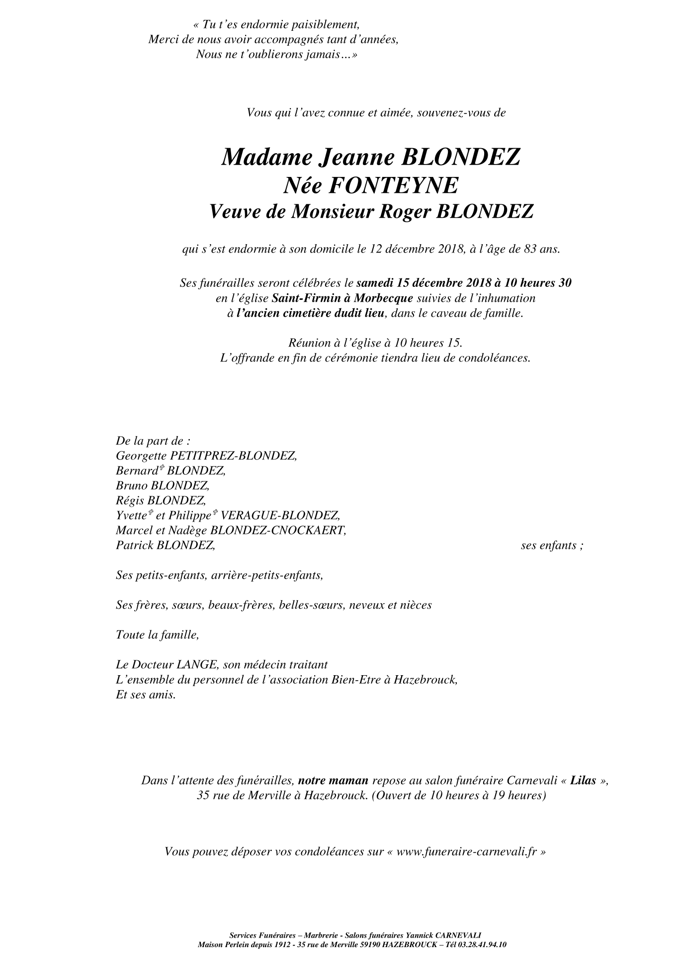 Décédée à Morbecque (59190, France) le mercredi 12 décembre 2018 à l'âge de 83 ans