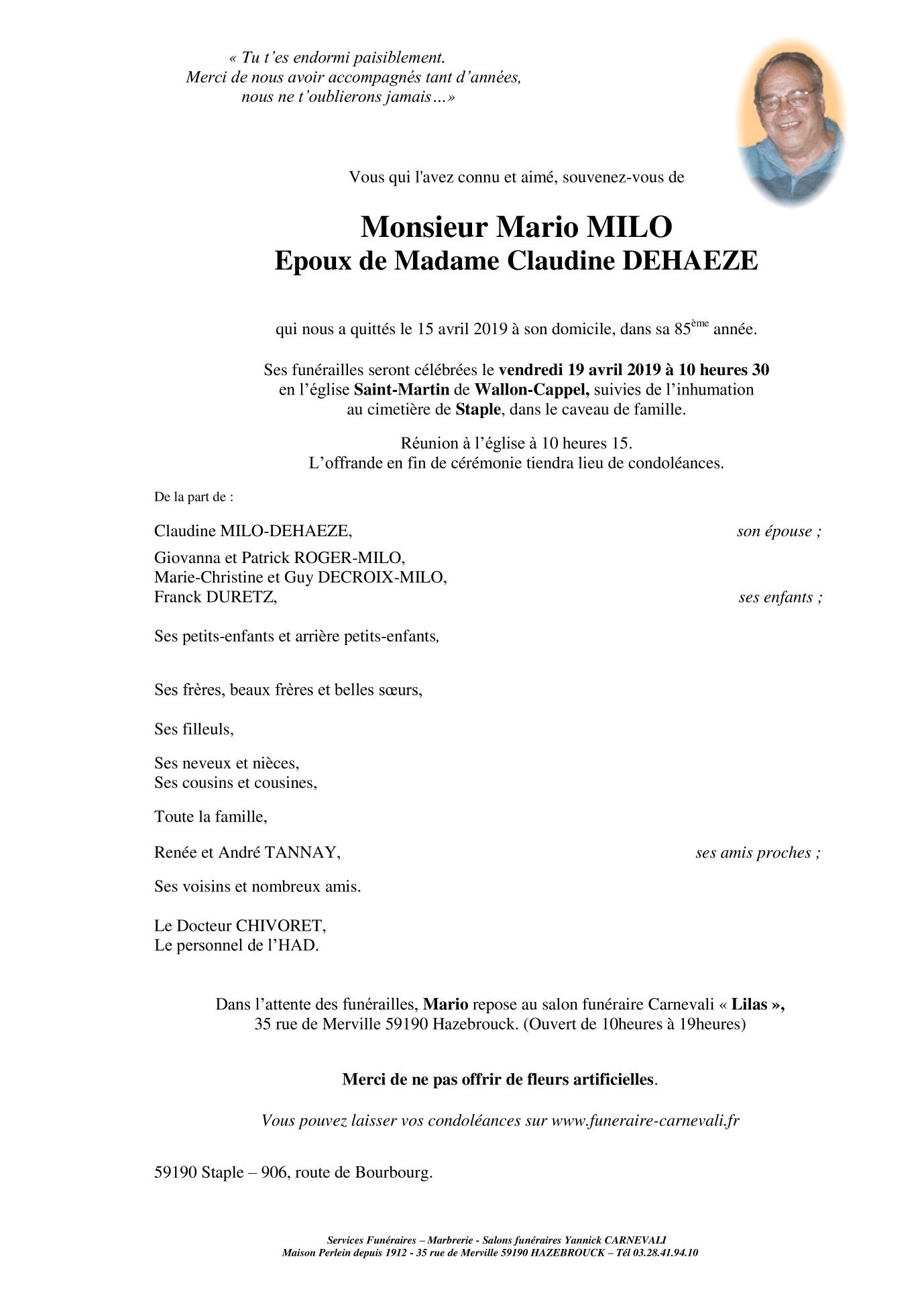 Décédé à Staple (59190, France) le lundi 15 avril 2019 à l'âge de 84 ans