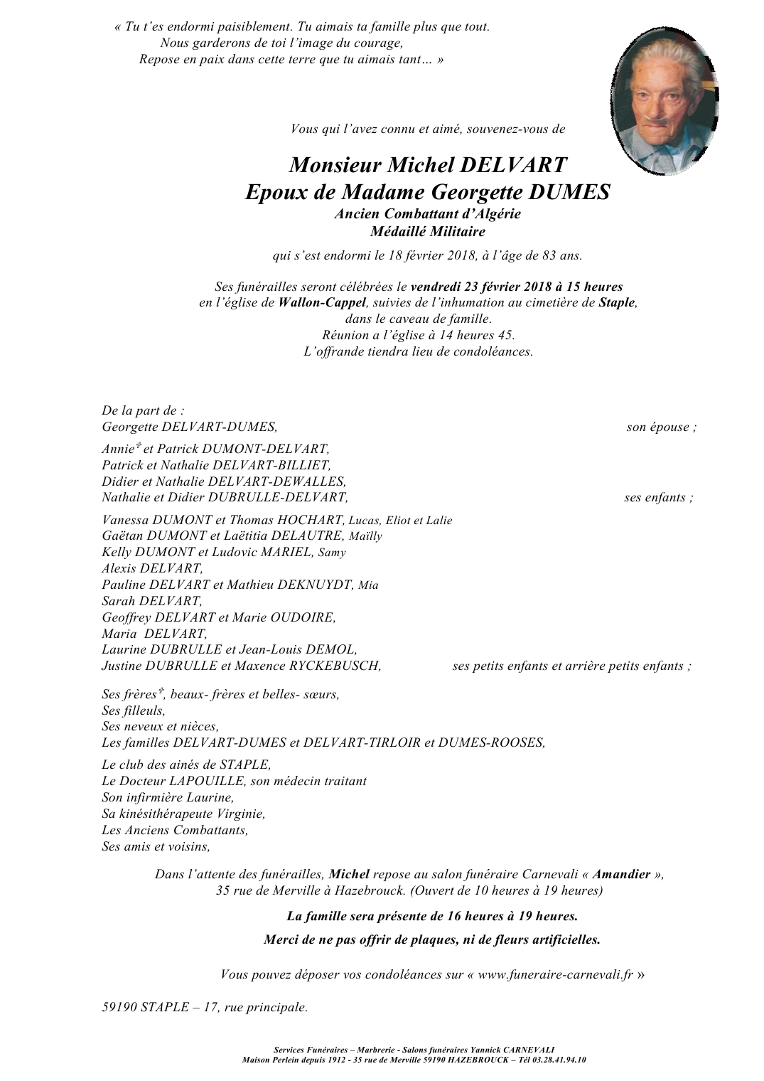 Décédé à Staple (59190, France) le dimanche 18 février 2018 à l'âge de 83 ans