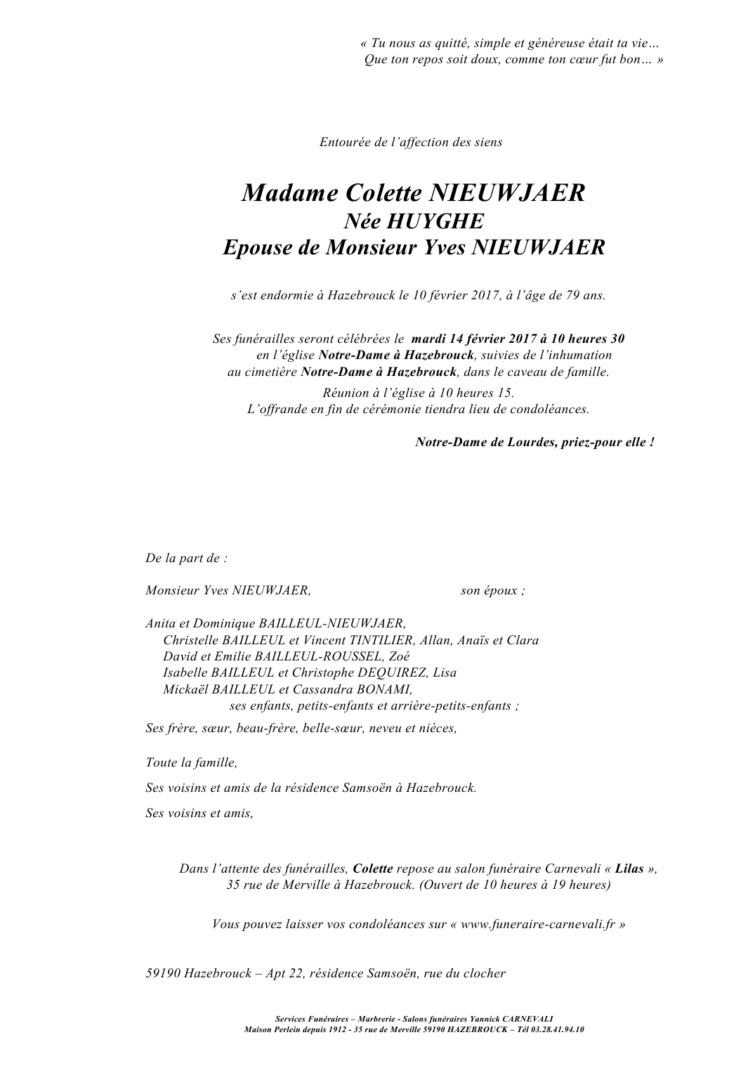 Epouse de Monsieur Yves Raymond Lucien NIEUWJAER