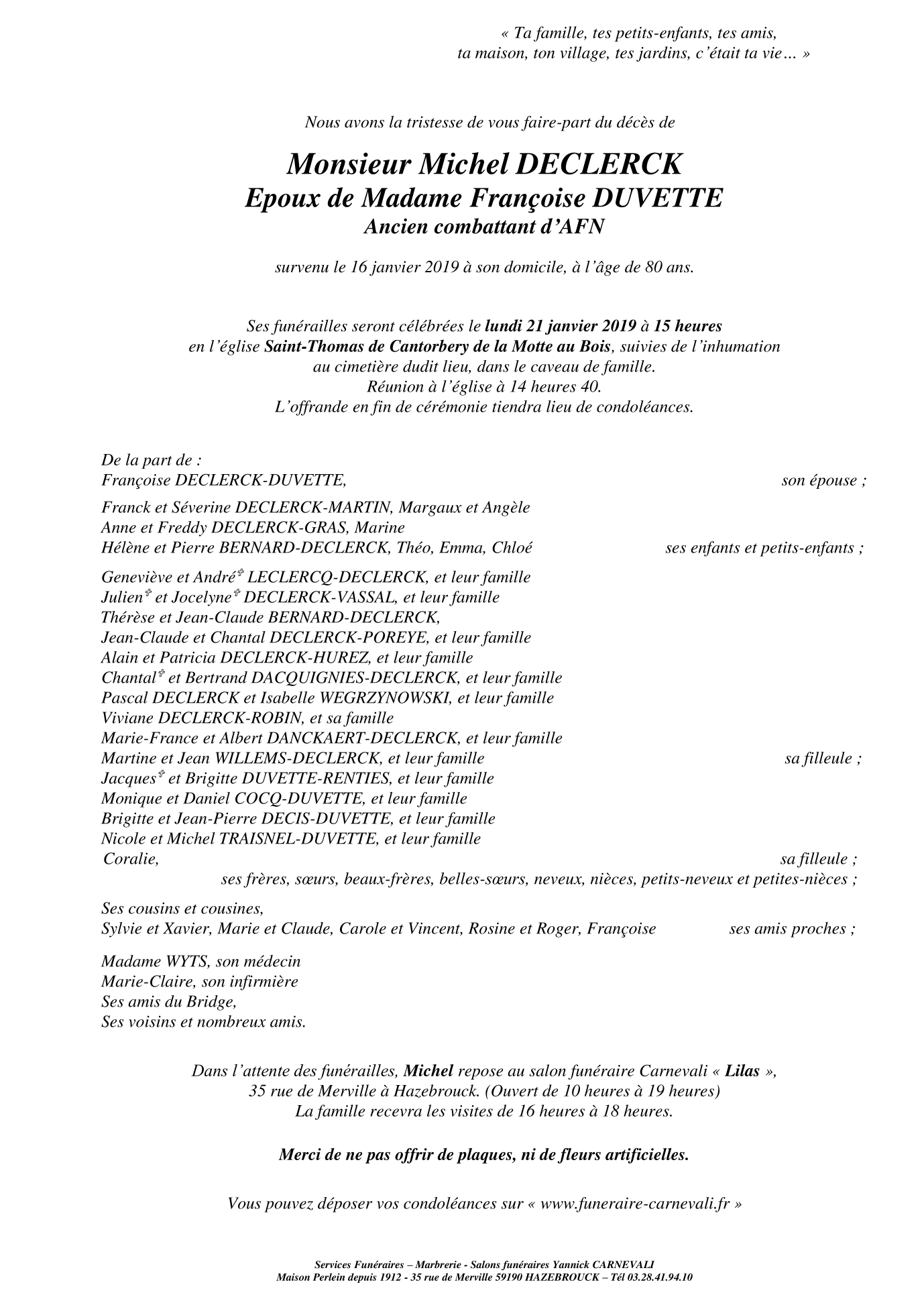 Décédé à Morbecque (59190, France) le mercredi 16 janvier 2019 à l'âge de 80 ans