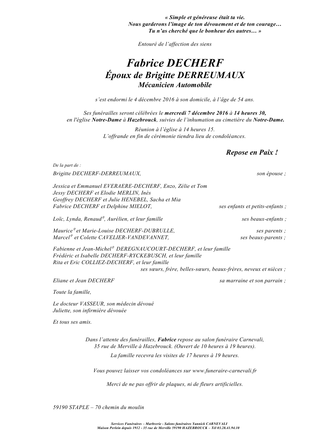 Décédé à Staple (59190, France) le dimanche 4 décembre 2016 à l'âge de 54 ans