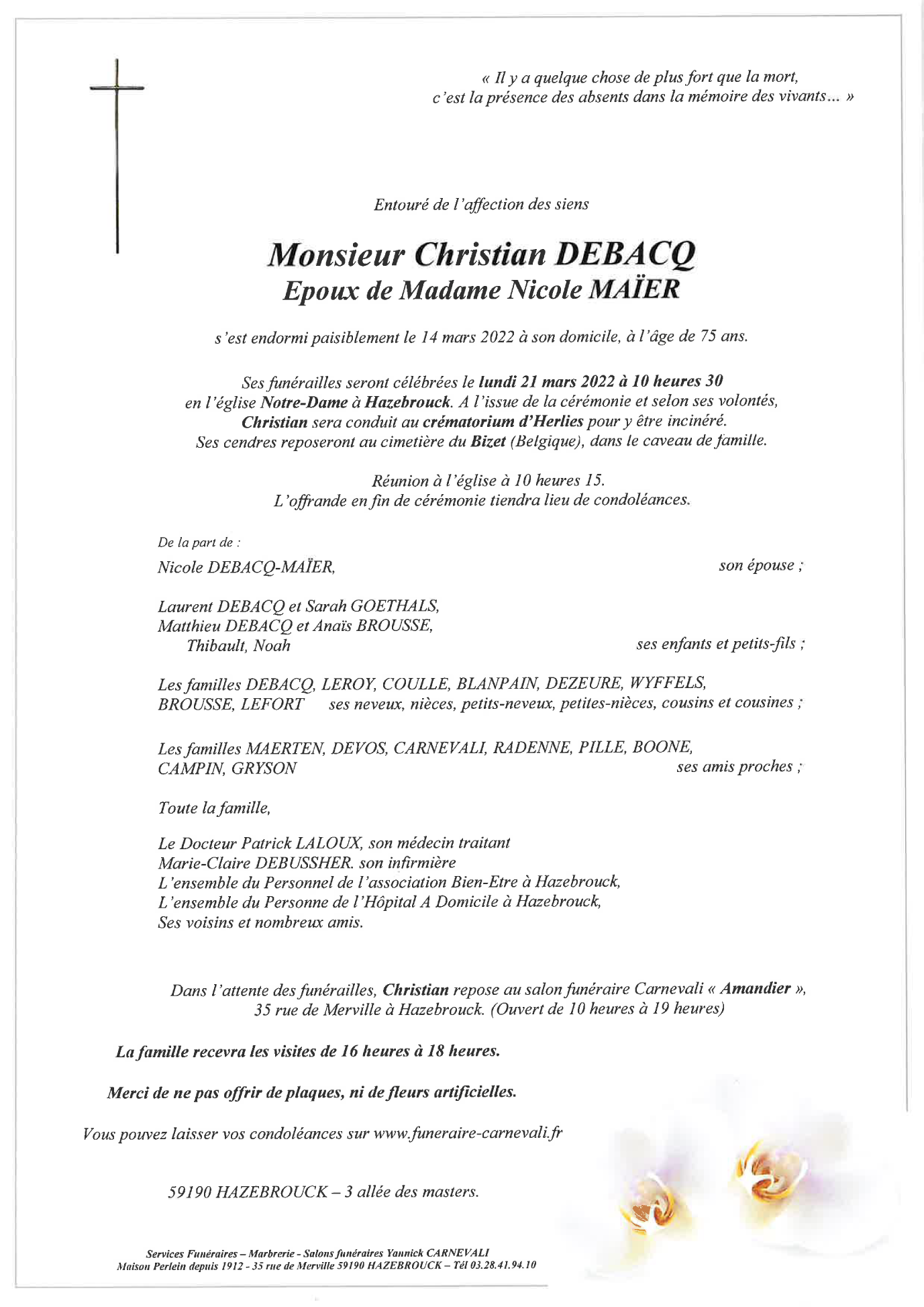Décédé à Hazebrouck (59190, France) le lundi 14 mars 2022 à l'âge de 75 ans