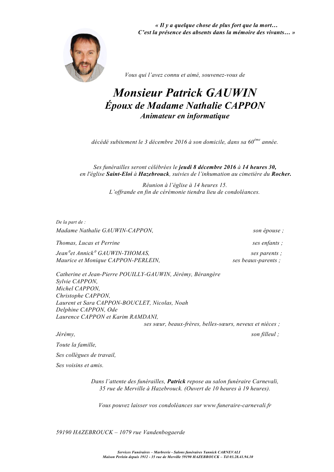 Décédé à Hazebrouck (59190, France) le samedi 3 décembre 2016 à l'âge de 59 ans