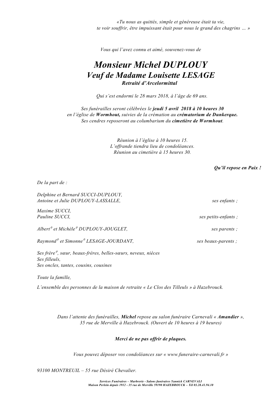 Décédé à Beuvry (62660, France) le mercredi 28 mars 2018 à l'âge de 69 ans