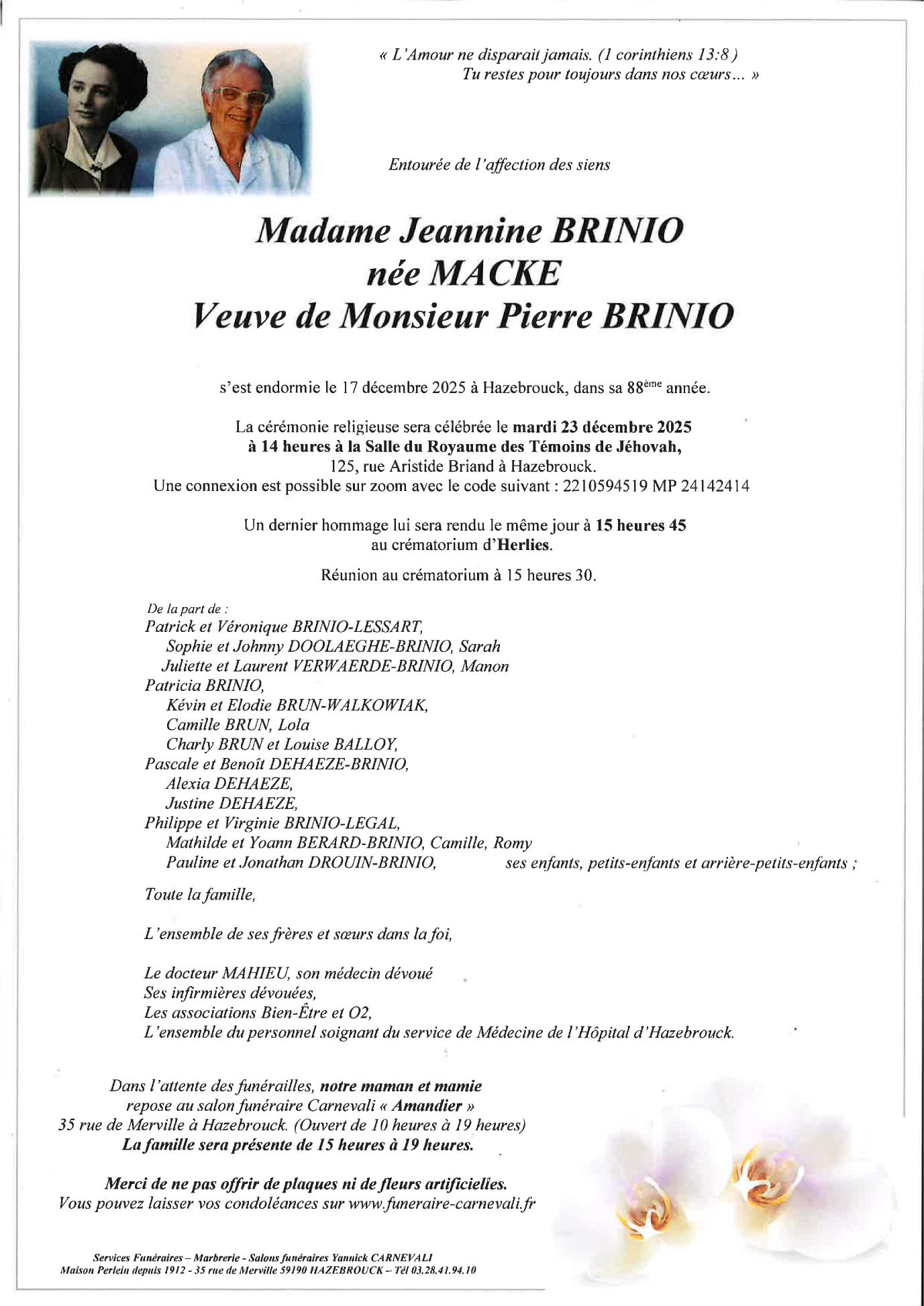 Décédée à Hazebrouck (59190, France) le mercredi 17 décembre 2025 à l'âge de 87 ans