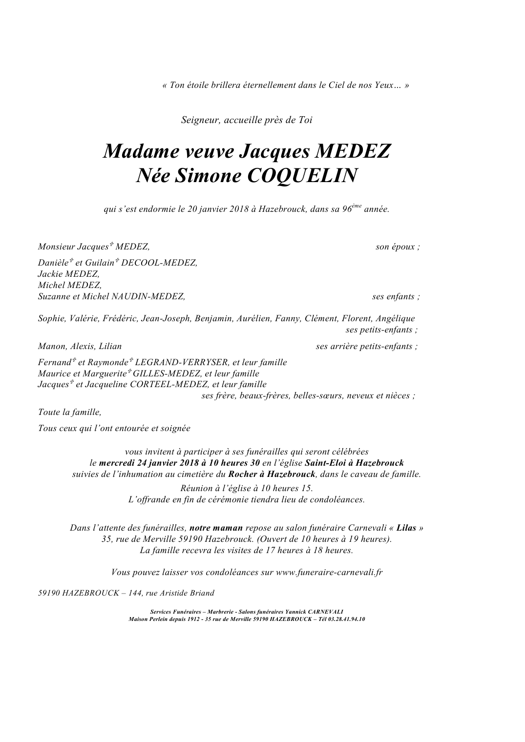 Décédée à Hazebrouck (59190, France) le samedi 20 janvier 2018 à l'âge de 95 ans