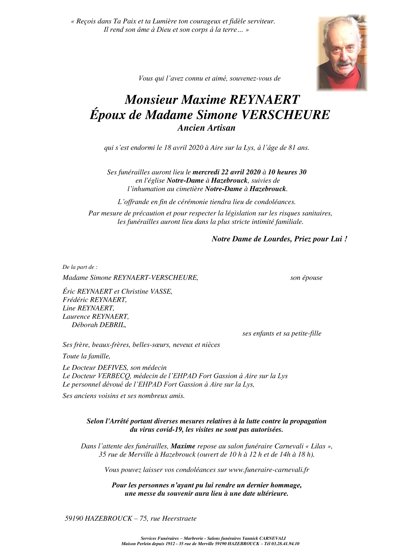 Décédé à Aire-sur-la-Lys (62120, France) le samedi 18 avril 2020 à l'âge de 81 ans